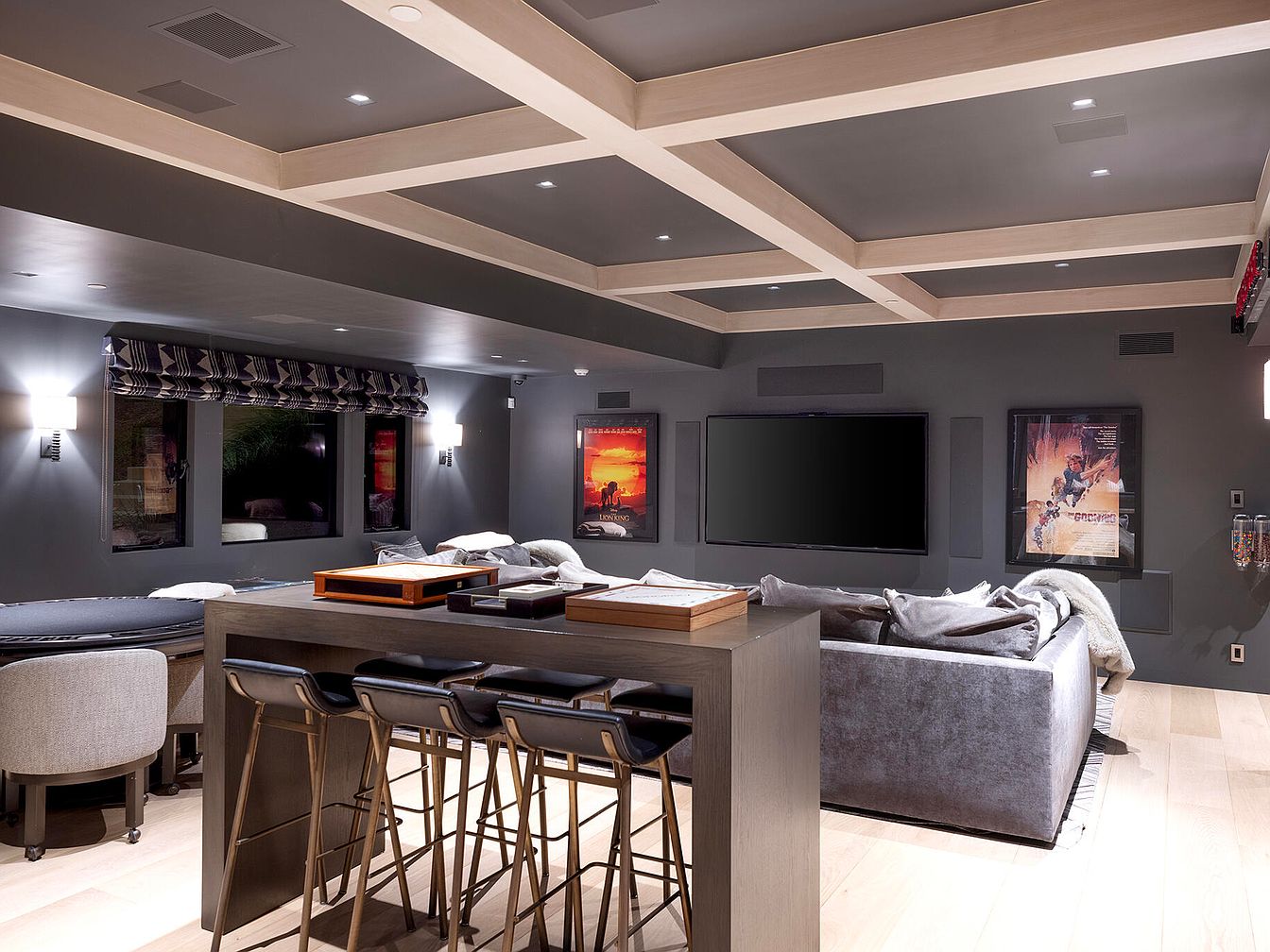 The space features a contemporary media room with a dark gray color scheme, creating an inviting ambiance. Sleek coffered ceilings with recessed lighting enhance the modern aesthetic. A plush, light gray sectional sofa is paired with warm wood elements and a stylish bar counter with high stools, ideal for social gatherings. Framed movie posters add personality to the walls, while the blackout shades on the windows combine practicality with style. Warm lighting from stylish sconces provides a cozy glow, emphasizing the inviting atmosphere perfect for movie nights or entertaining guests.