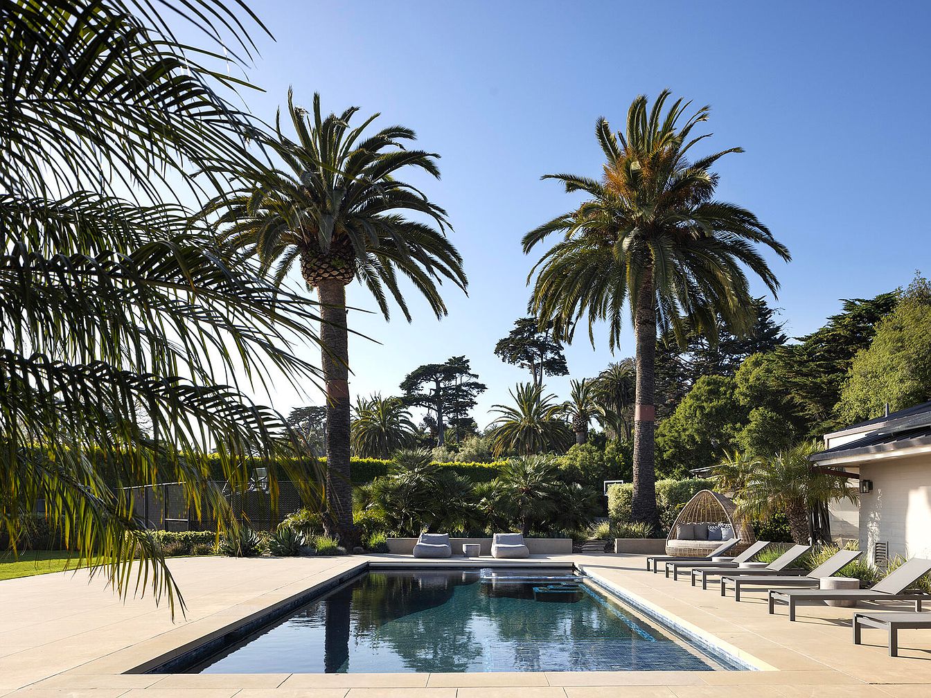 The space showcases a modern pool area surrounded by lush landscaping and towering palm trees, creating a tropical ambiance. A clear blue sky enhances the serene environment. The rectangular swimming pool features a sleek design, bordered by smooth, large tiles that extend into a sunbathing area equipped with contemporary lounge chairs. A cozy, woven swing chair adds an inviting touch, promoting relaxation. The vibrant greenery contrasts beautifully with the beige and blue tones, enriching the aesthetic appeal. Overall, the layout emphasizes a harmonious blend of nature and luxury, perfect for leisure and outdoor gatherings.