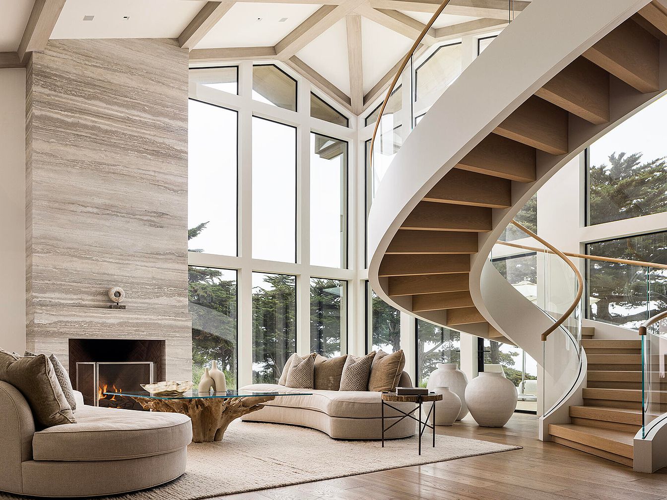 This spacious living room features an elegant and modern design, highlighted by high, angular ceilings and expansive floor-to-ceiling windows that flood the space with natural light. The color palette consists of soft neutrals and earthy tones, creating a warm and inviting atmosphere. A circular beige sofa, adorned with plush throw pillows, complements a unique coffee table made from natural wood. Near the cozy fireplace, a modern, minimalist design provides a focal point, while a gracefully curved staircase with light wooden steps leads to the upper level, enhancing the room’s sophistication and open flow.