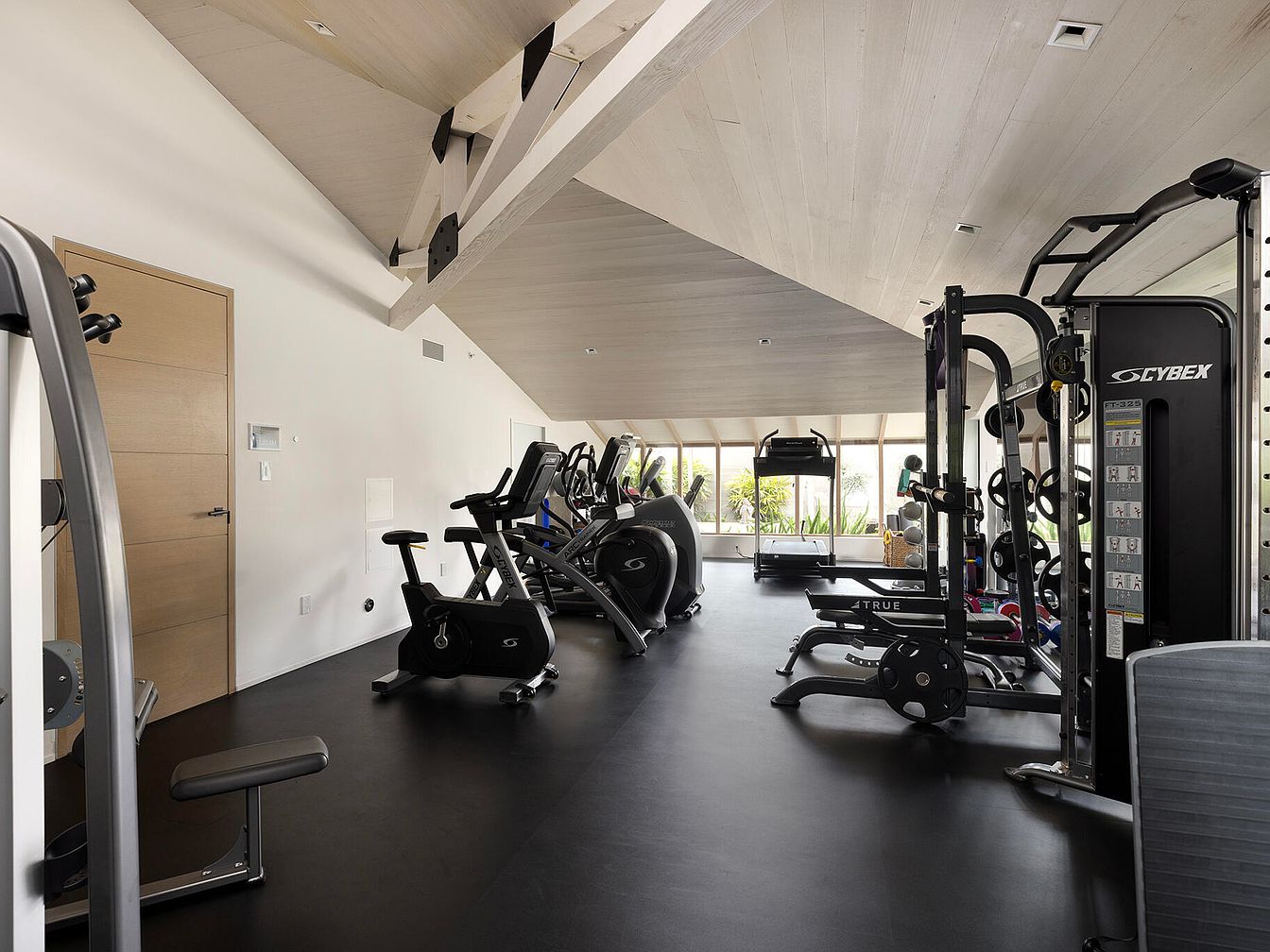 This modern home gym features a minimalist design with a spacious layout. The floor is covered with sleek, dark rubber flooring, providing a practical and stylish surface for workouts. On one side, various fitness equipment, including treadmills, stationary bikes, and weight machines, are neatly arranged, promoting an inviting exercise environment. The ceiling showcases exposed wooden beams that enhance the airy feel of the room. Ample natural light floods in through large windows, offering views of the surroundings while maintaining privacy. A warm color palette of light wood and white walls creates a calming atmosphere, ideal for fitness enthusiasts.