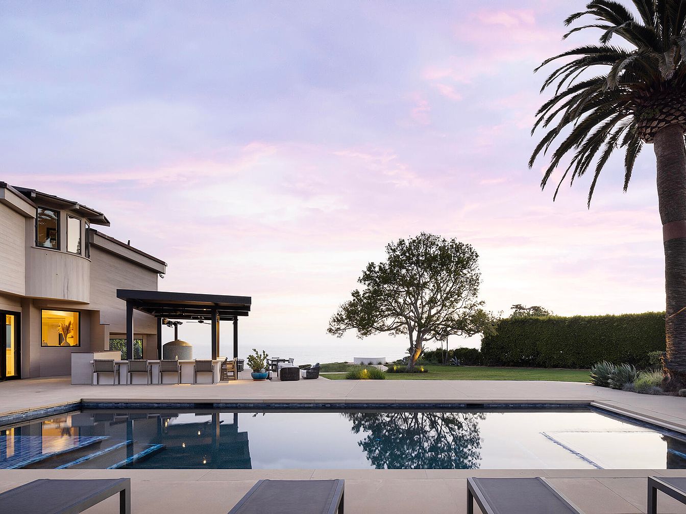 The outdoor space features a sleek pool framed by a modern concrete deck, reflecting the soft pastel colors of a sunset sky. Designed for relaxation, lounge chairs line the pool’s edge, providing an inviting area for sunbathing. A stylish patio with a contemporary roof offers shaded seating, enhancing the space’s functionality. The layout emphasizes open sightlines to the ocean beyond, with lush greenery and palm trees creating a serene backdrop. Textural contrasts are evident in the smooth pool tiles and polished stone surfaces, merging luxury with nature, while the overall color palette remains soft and harmonious.