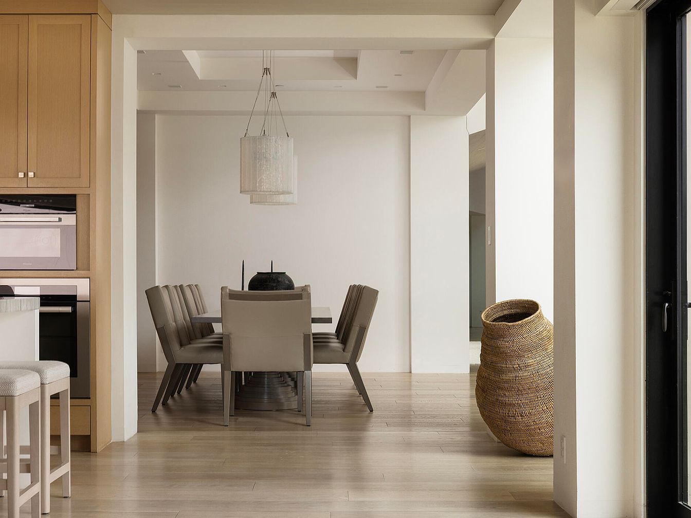 This dining area features a sleek, modern design defined by a light color palette. At the center, a large round table is surrounded by plush, beige chairs, creating a warm yet refined atmosphere. A stylish, pendant light hangs above, adding an elegant touch. The walls are painted in soft white, enhancing the spacious feel, while the hardwood flooring provides a natural warmth. On a nearby wall, minimalistic cabinetry complements the aesthetic, housing built-in appliances. A textured, woven basket rests on the floor, introducing an element of organic design, harmonizing with the overall contemporary elegance of the space.