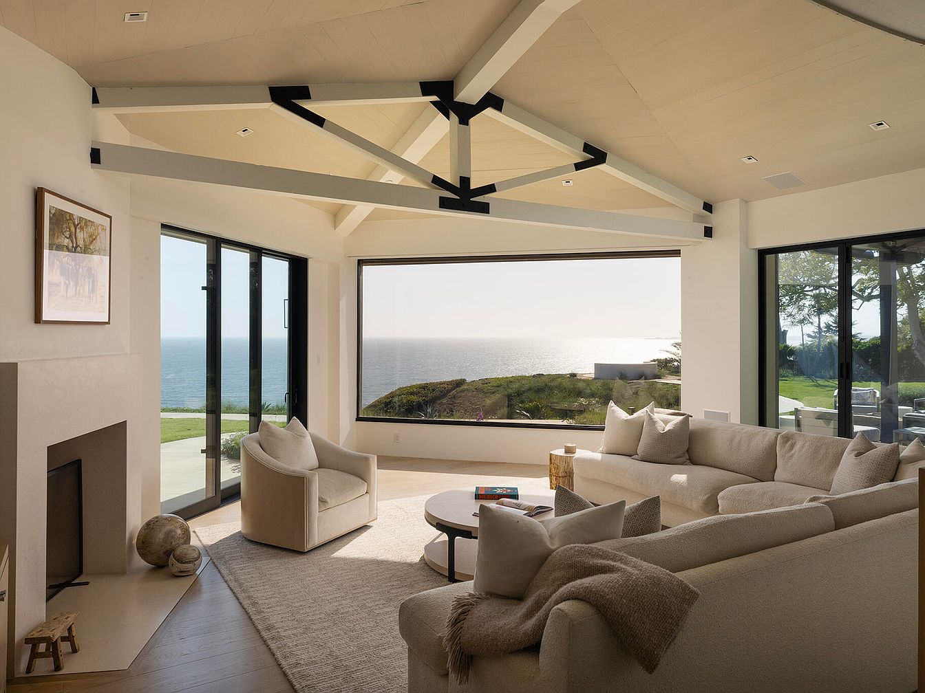 This living room features a spacious, open layout with large, panoramic windows offering breathtaking ocean views. The color palette consists of soft neutrals, emphasizing calmness and tranquility. A plush, beige sectional sofa invites relaxation, complemented by rounded armchairs that enhance comfort. A coffee table, made from natural wood, serves as a focal point, while carefully placed decor adds warmth. Exposed wooden beams decorate the ceiling, adding an element of rustic charm. A modern fireplace integrates functionality with aesthetics, and the subtle textures of the rugs and fabrics enrich the overall inviting atmosphere, perfect for leisure and gatherings.