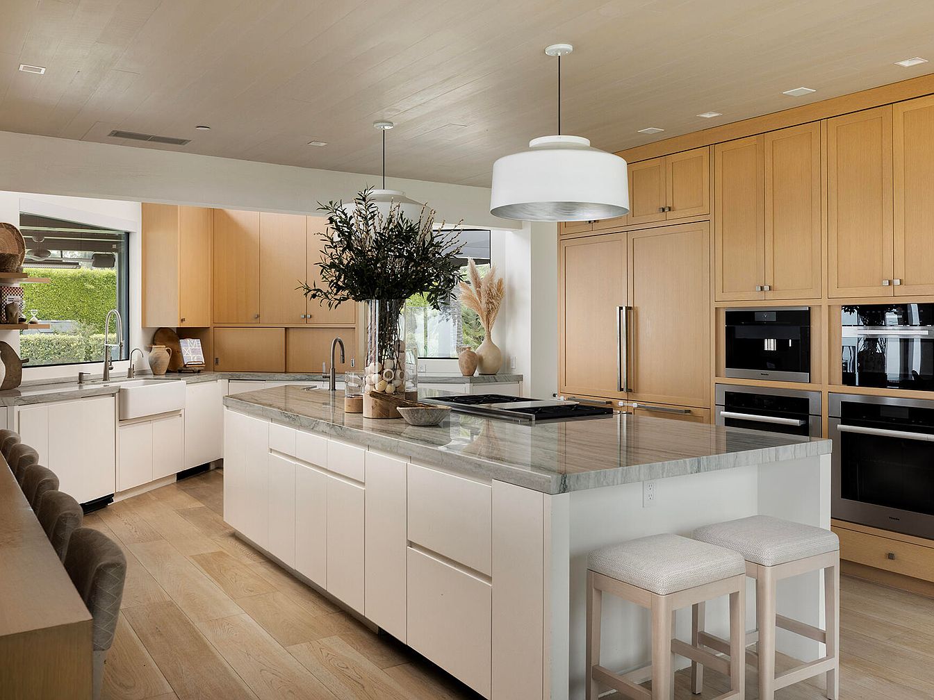 The kitchen features a spacious design with sleek cabinetry in warm wood tones, enhanced by a contrasting white island. A large, marbled countertop serves as a central gathering place, complemented by plush, cushioned stools. Natural light streams in through expansive windows, illuminating a minimalist aesthetic. Stainless steel appliances are seamlessly integrated within the cabinetry, showcasing modern technology. Decorative elements, such as a vase with greenery on the island, add a touch of life. The neutral color palette, combined with light wooden flooring, creates an inviting and contemporary atmosphere, perfect for both cooking and entertaining.