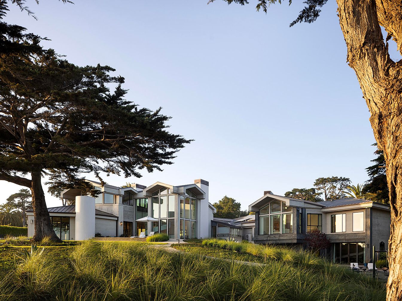 The image showcases a modern home set against a serene landscape. The house features a mix of sloped rooftops and large glass windows, creating a dynamic silhouette. Neutral tones blend seamlessly with the natural surroundings, while the extensive use of glass invites natural light and creates a sense of openness. Lush greenery surrounds the property, enhancing the tranquil atmosphere. The carefully landscaped yard features tall grasses and shrubs that complement the building’s design. Architectural elements like the white cylindrical structure and angular corners contribute to a contemporary aesthetic, reflecting harmony between nature and modern living.