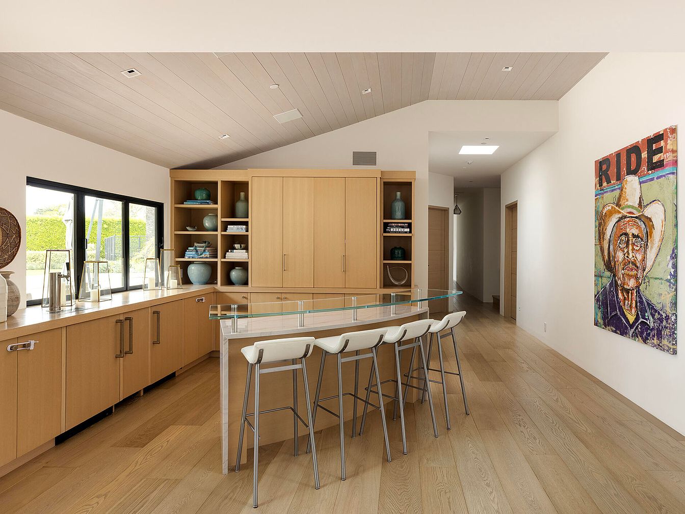 This contemporary kitchen features minimalist cabinetry in light wood tones, enhancing the sense of space. A long counter with a sleek glass top contrasts with metal bar stools, perfect for casual dining. The room benefits from natural light through expansive windows, showcasing an outdoor view. Decorative items, including turquoise vases, add vibrant accents to the shelving, while a large artwork of a cowboy named ‘RIDE’ injects character and color into the room. The sloped ceiling enhances the airy feel, while smooth wood flooring complements the overall warm palette, creating a welcoming atmosphere.