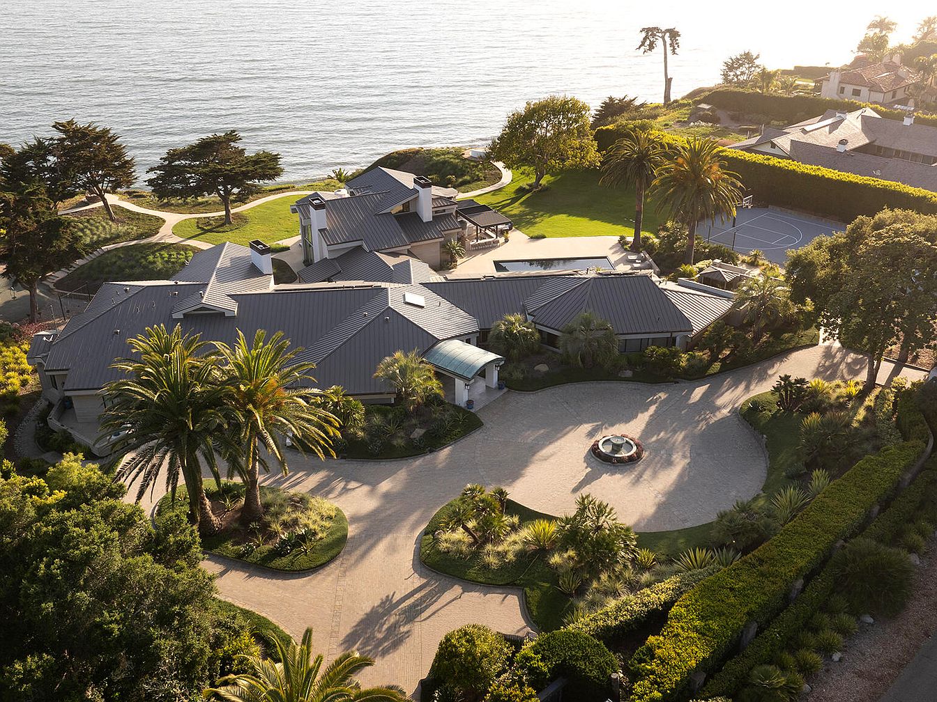 Aerial view of a luxurious coastal property showcasing a contemporary home with a distinctive, angular roofline. The expansive driveway, paved with elegant stonework, leads to a central circular fountain, surrounded by lush tropical landscaping. Various palm trees and vibrant greenery create a tropical ambiance that complements the serene waterfront. Beyond the house, a basketball court is visible, adding leisure space surrounded by manicured lawns. The backdrop features a calming ocean, enhancing the property’s charm. Sunlight glimmers on the water’s surface, illuminating the entire scene with a warm, inviting glow, highlighting the home’s coastal elegance.