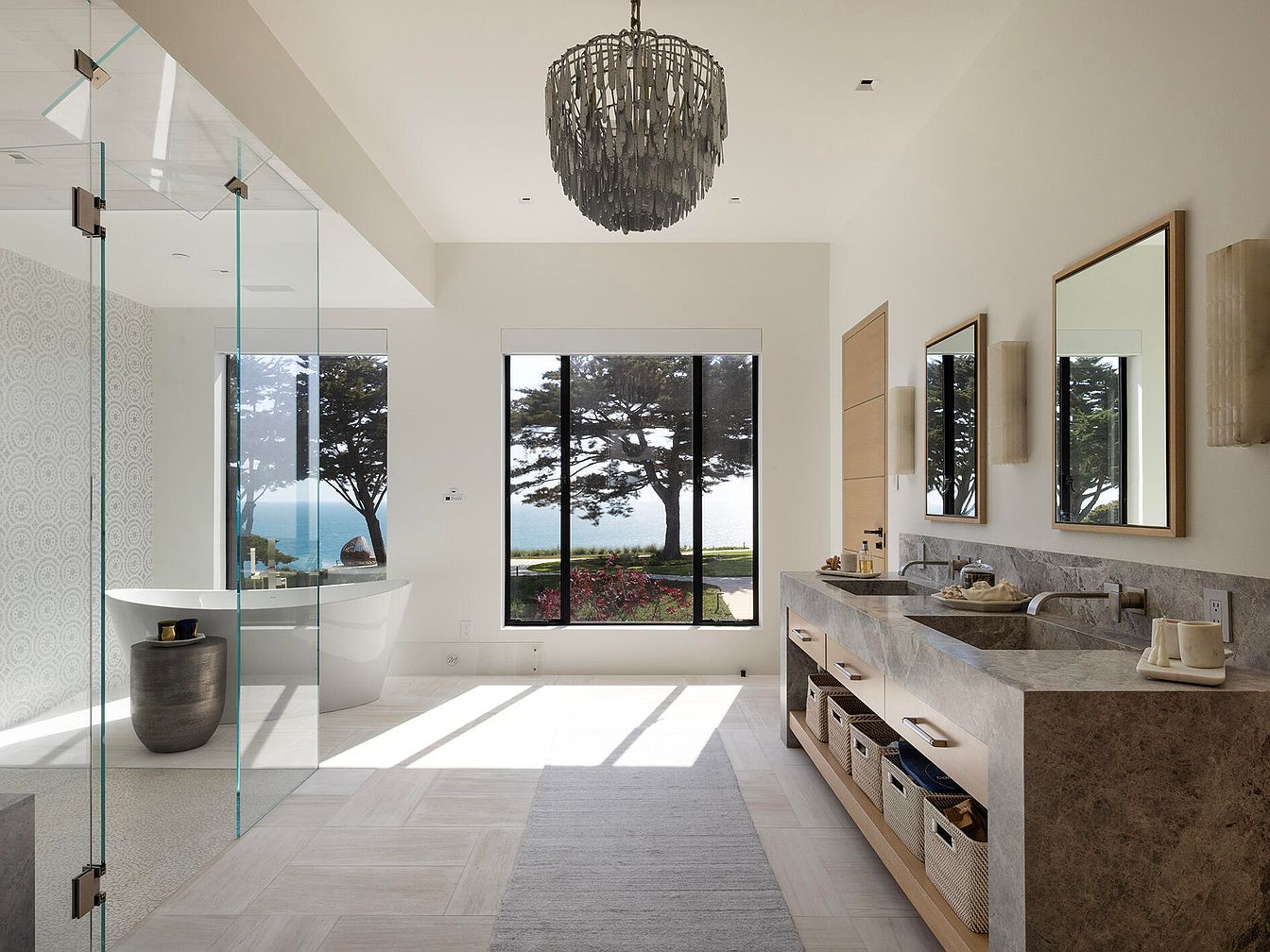 This spacious bathroom features a contemporary design with a neutral color palette that emphasizes tranquility. A large glass shower enclosure provides an open feel, while a sleek freestanding tub adds to the luxury. The dual sink vanity showcases elegant stone countertops and minimalist cabinetry, offering ample storage with woven baskets. Two round mirrors above the sinks reflect natural light, enhancing the space’s brightness. The expansive window invites stunning views of the outdoors, seamlessly blurring the line between indoor and outdoor spaces. Soft lighting fixtures contribute warmth, while geometric patterns on one wall add texture and interest.
