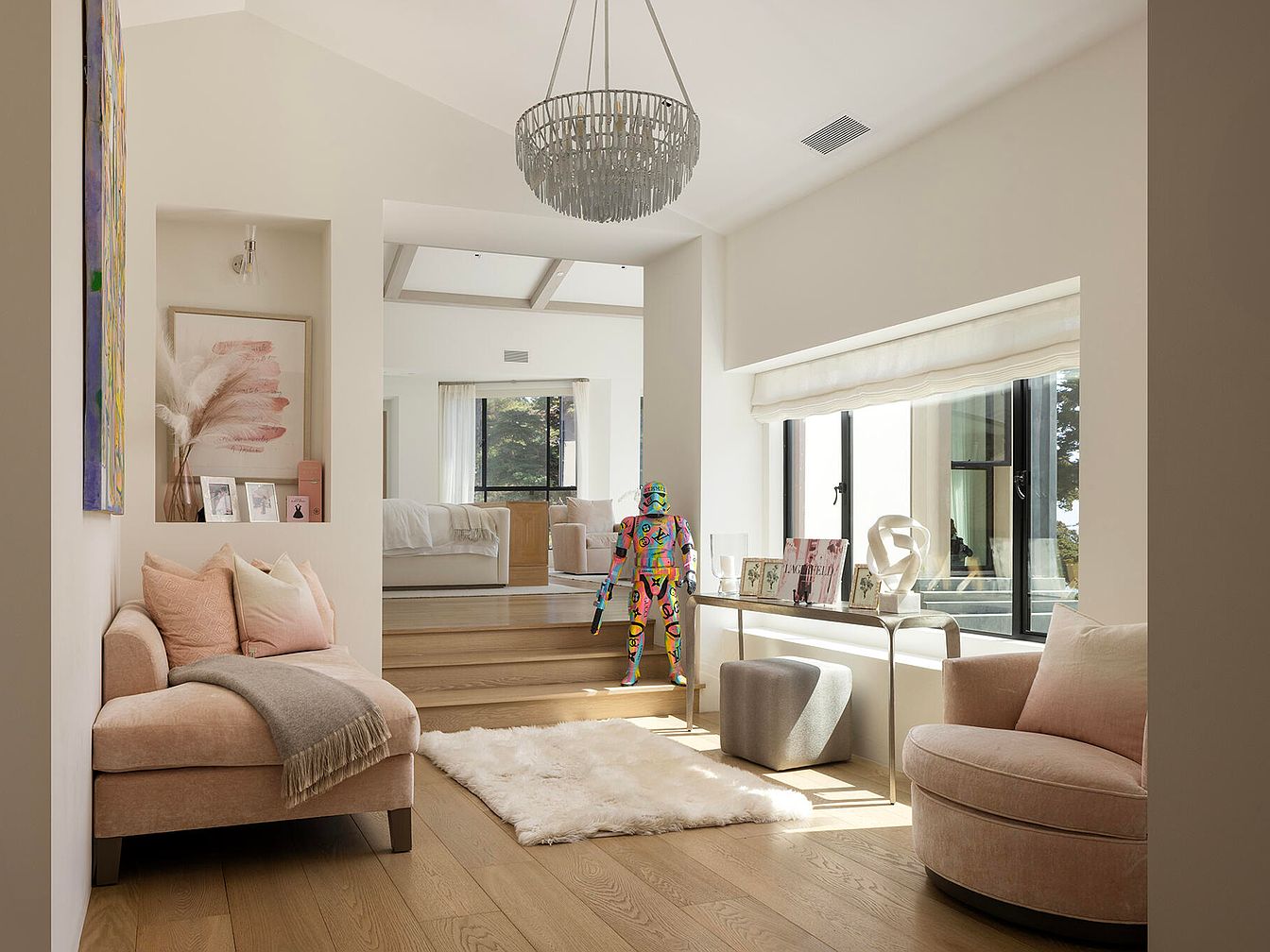 This cozy living room features a harmonious blend of modern and playful elements. Soft beige walls complement the warm wooden flooring, enhancing the space’s inviting atmosphere. A pastel pink armchair with decorative cushions provides a pop of color, while a light gray throw adds texture. The sleek side table showcases artful sculptures and colorful books. Large windows invite natural light, highlighting both the simplicity and artistry within. A whimsical multicolored figure stands near the staircase, offering a striking contrast against the neutral backdrop. Overall, the design balances comfort with a touch of contemporary flair.
