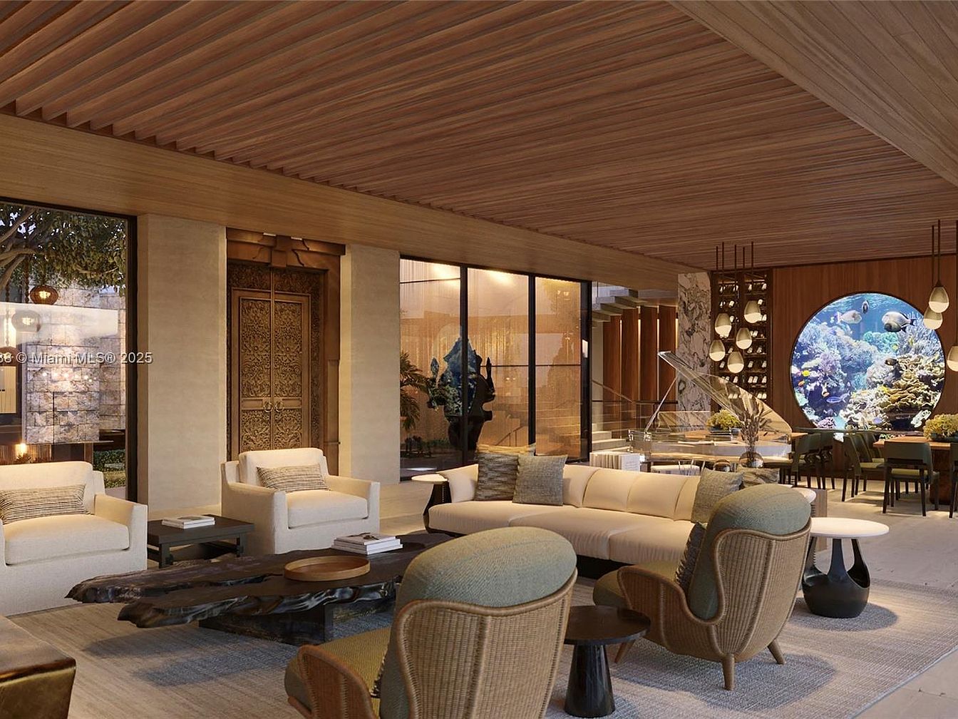 A spacious living room characterized by a modern open layout. The ceiling features detailed wooden slats, adding warmth and texture. Light-colored walls contrast with the rich, textured wooden accents. Elegant white sofas with subtle patterns surround a unique organic-shaped wooden coffee table, creating a focal point. Across the room, expansive glass doors lead to an outdoor space, allowing natural light to flood in. A stunning circular aquarium integrated into the wall showcases vibrant marine life, enhancing the space’s aesthetic. Soft area rugs in neutral tones complement the understated decor, contributing to an inviting and tranquil atmosphere.