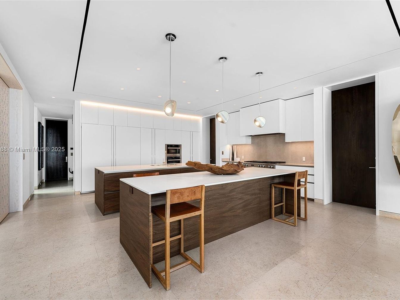 The kitchen showcases a modern, open layout with two large islands as focal points, featuring a sleek white countertop and rich wooden bases. Minimalist cabinetry in white embraces the walls, creating a clean, airy feel, while recessed lighting adds warmth and brightness. Textured beige tiles line the floor, enhancing the serene atmosphere. Adorning the space, stylish pendant lights drop down from the ceiling, illuminating the area with a soft glow. A subtle contrast is created by dark wooden accents on cabinetry and doors, merging contemporary design with natural elements, ensuring a sophisticated yet inviting culinary environment.