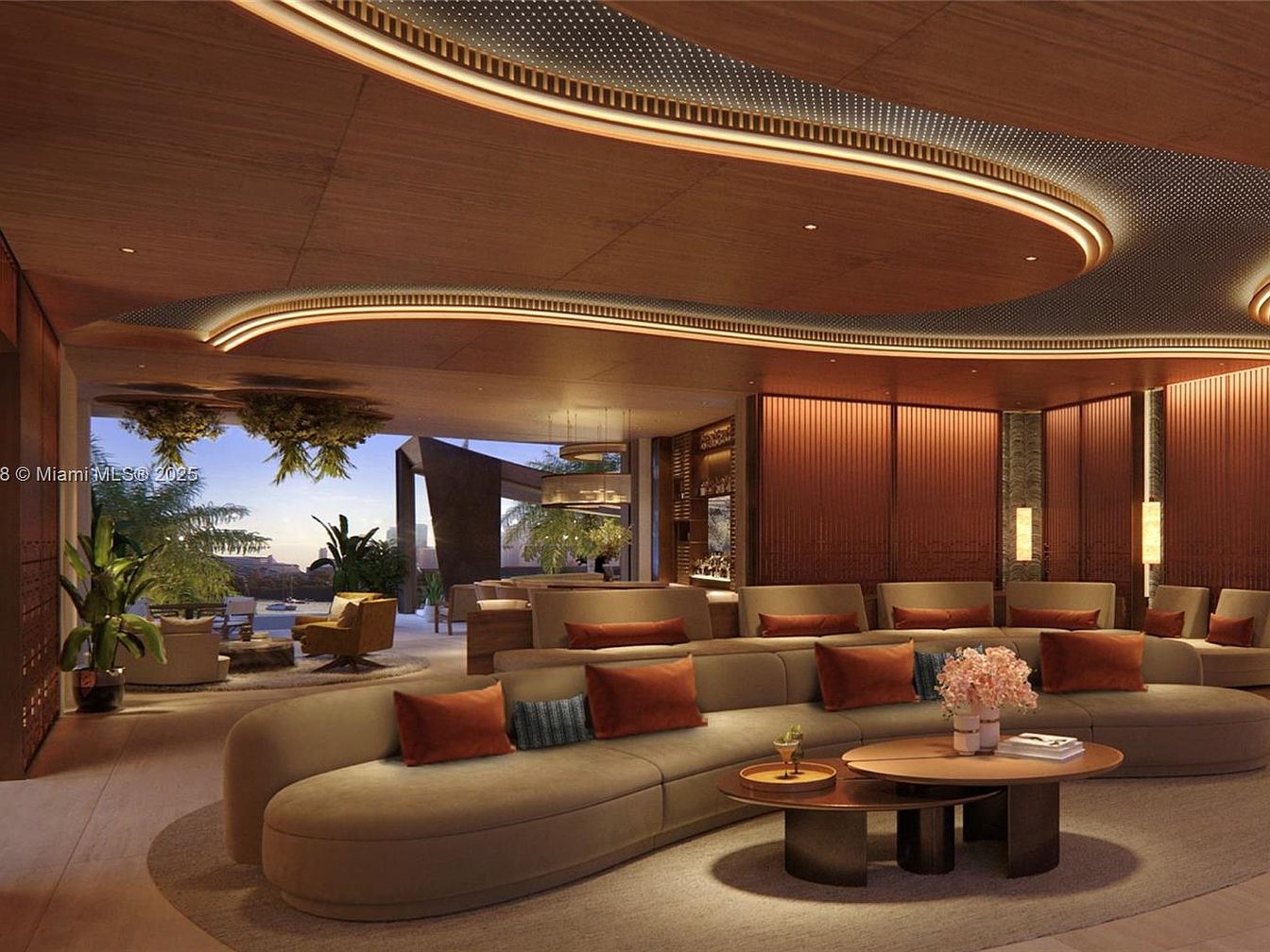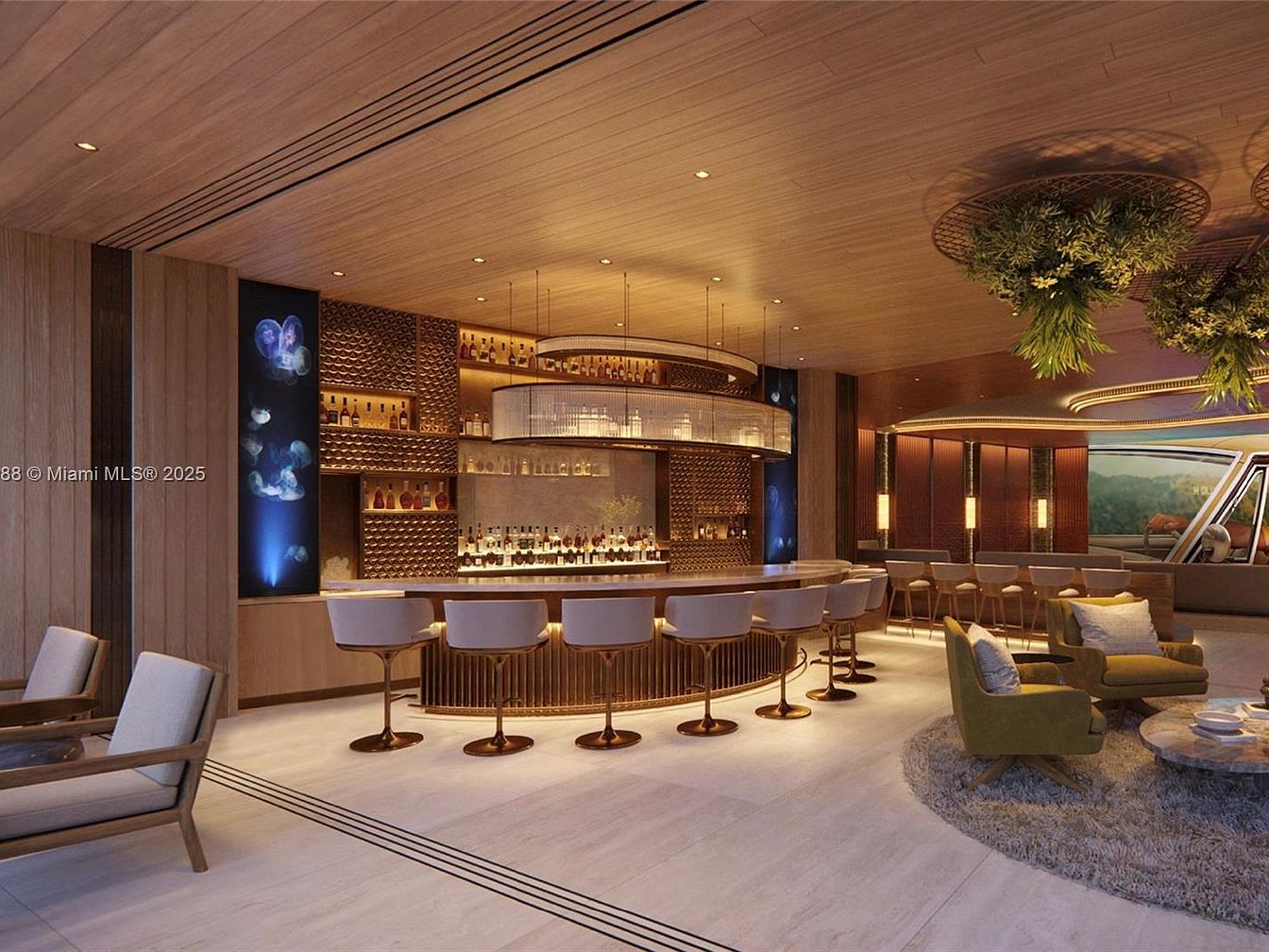 This bar area features a sleek, modern design with warm wooden accents and sophisticated lighting. The bar counter, elegantly curved, is lined with plush, high-backed stools that invite relaxation. Behind the bar, an array of bottles is showcased against a textured wall, illuminated by soft ambient lighting that highlights the rich colors. A cozy seating arrangement includes stylish armchairs and a circular coffee table, enhancing a conversational atmosphere. The floor exhibits a light-colored stone with contrasting dark lines, while overhead, lush greenery adds a touch of nature, creating a harmonious blend of elegance and comfort.