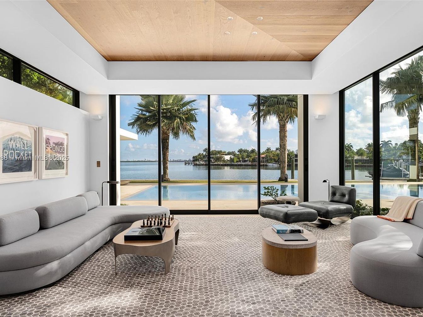 A stylish living room featuring floor-to-ceiling windows that showcase a stunning waterfront view. The space is adorned with a neutral color palette dominated by soft gray tones, complemented by a natural wood ceiling that adds warmth. A curved, modern gray sectional sofa invites relaxation, paired with a minimalist oval coffee table made of light wood. A chic black lounge chair and footrest provide additional seating. The hexagonal-patterned rug enhances texture underfoot, while framed artwork on the walls adds subtle personal touches. Palm trees outside blend seamlessly with the indoor aesthetic, creating a serene ambiance.