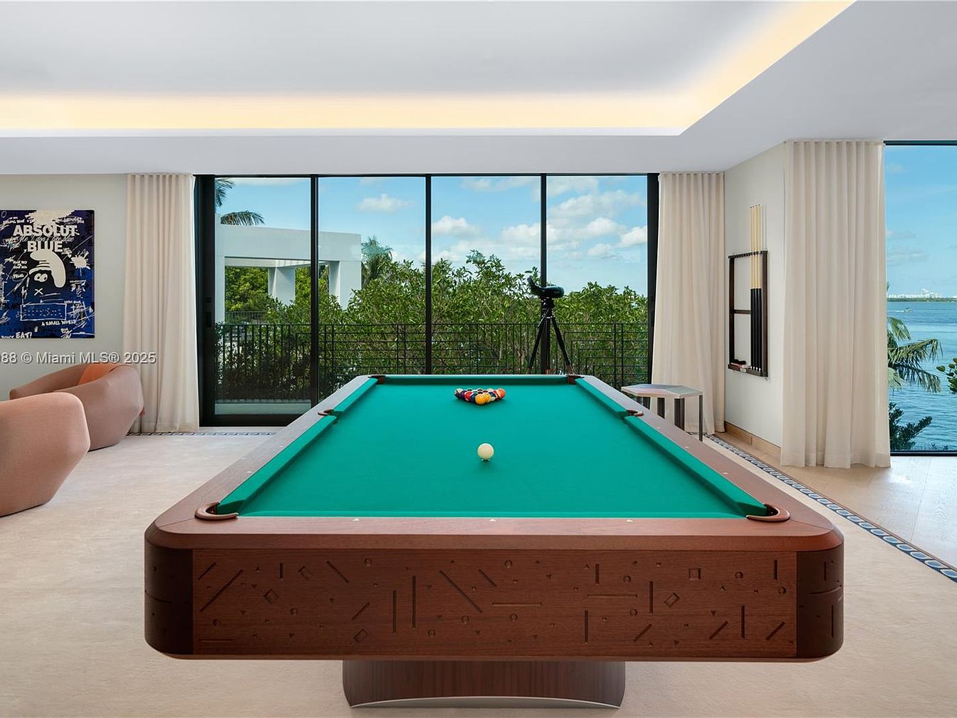 A spacious game room featuring a vibrant green pool table as the centerpiece, complemented by a rich wooden frame. The room showcases large floor-to-ceiling windows that offer stunning views of the outdoors, filled with lush greenery and water. Light beige walls contribute to a warm, inviting ambiance, while sheer white curtains soften the natural light streaming in. Soft, curved furniture in muted pink tones contrasts elegantly with the game table. A modern art piece decorates one wall, adding a splash of color and character to the space. Simplicity and style blend seamlessly for a comfortable yet sophisticated atmosphere.