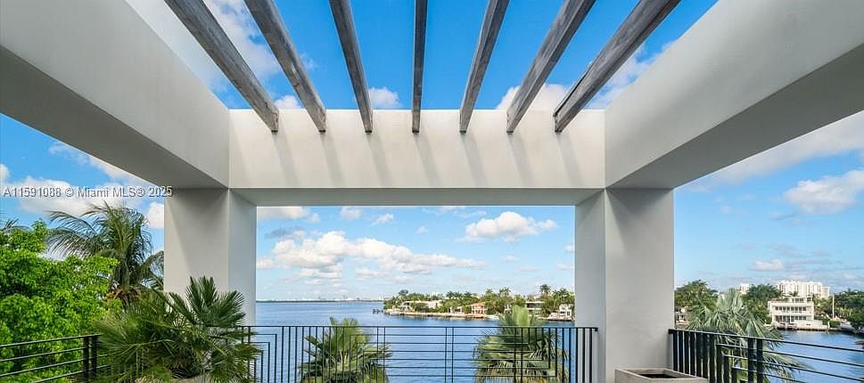 This balcony offers a stunning view framed by modern architectural details. Large openings reveal a vibrant waterway, surrounded by lush greenery and elegant homes across the shore. The color palette includes soft whites and natural wood beams that contrast with the vibrant blue sky, enhancing an airy atmosphere. Sleek black railings add a contemporary touch while maintaining unobstructed sightlines. Sunlight streams through the open spaces, creating dynamic shadows. This serene space merges indoor and outdoor living, reflecting a seamless transition complemented by tropical plants, inviting relaxation and appreciation of the picturesque surroundings.