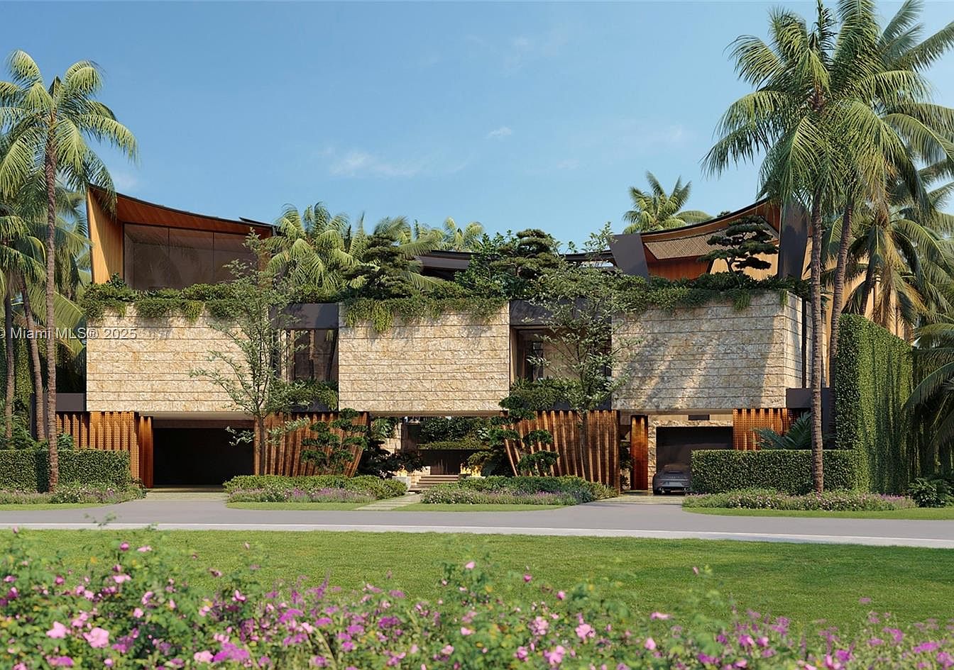 The house showcases a modern architectural design with a striking blend of stone, wood, and glass. The front façade is primarily composed of a light-colored stone, accentuated by dark wooden elements that define the structure’s bases. Lush greenery, including palm trees and neatly trimmed bushes, surrounds the property, contributing to a tropical ambiance. The roof features an elegant curve, highlighting the contemporary aesthetic while also providing ample natural light through floor-to-ceiling windows. A driveway leads to an integrated garage, seamlessly connecting the indoor and outdoor spaces, inviting nature into the overall living experience.