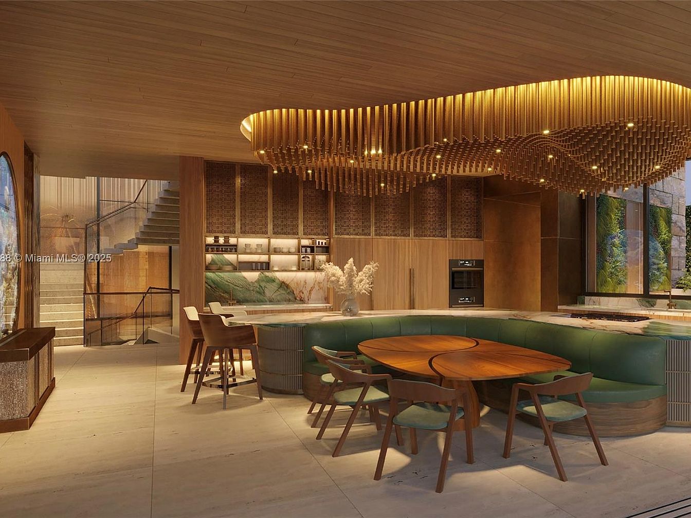 This dining area features a modern aesthetic with a warm, inviting atmosphere. A stunning wave-like chandelier made of wooden slats stretches across the ceiling, creating an eye-catching focal point. The color palette blends natural wood tones with soft green upholstery on the circular banquette, which surrounds a set of sleek, oval wooden tables. A harmonious balance of textures is seen in the cabinetry and stone surfaces, complemented by large windows that bring in ample natural light and connect the interior to the lush outdoor environment. A subtle elegance defines the layout, enhancing the space’s contemporary appeal.