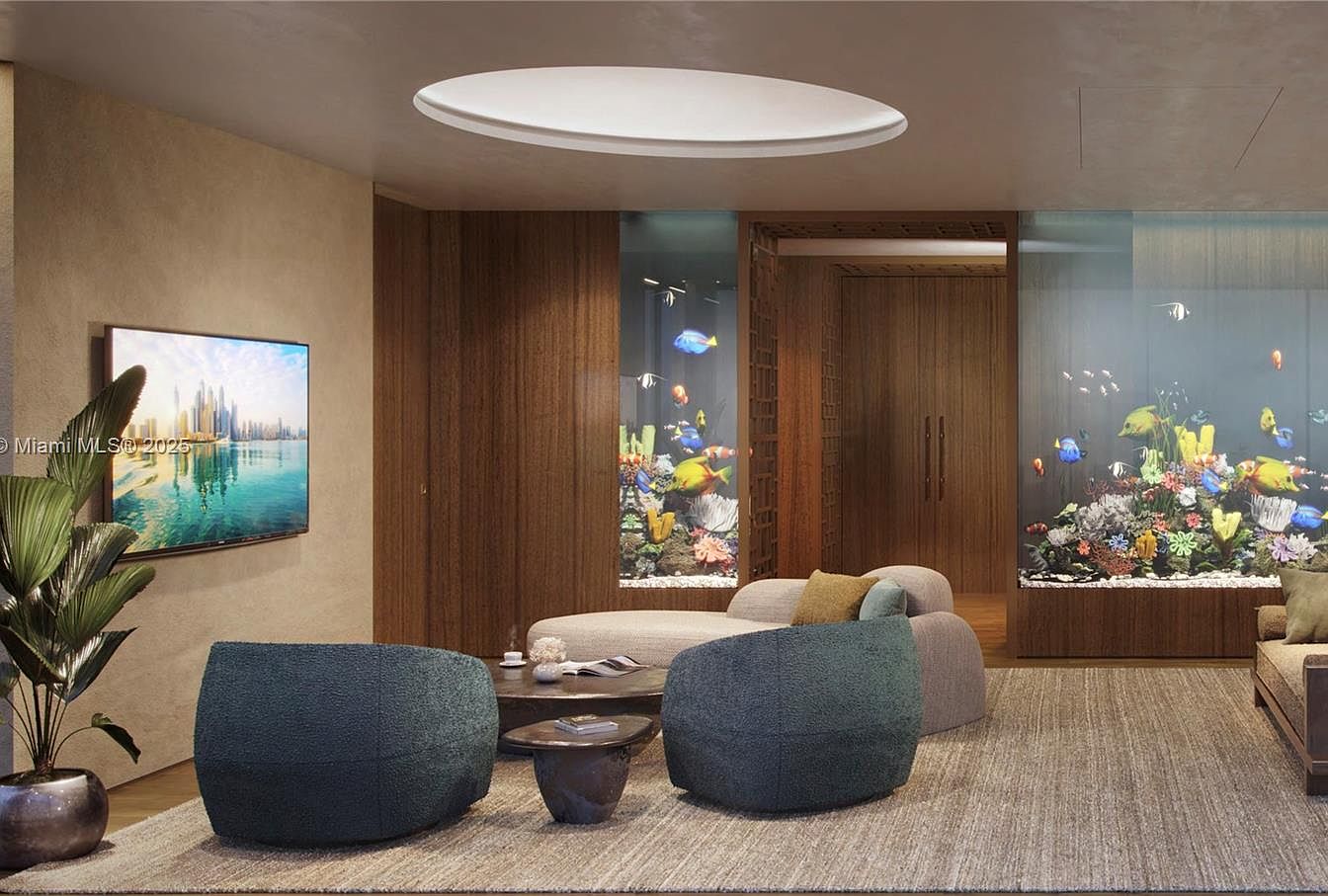 This living room features a sleek and modern design, showcasing a mix of textures and colors. Two oversized, plush chairs in muted green and light beige create a cozy seating area, complemented by a dark, organic-shaped coffee table. A large television is mounted on a textured wall, with a scenic city view displayed. Behind the seating, a striking aquarium with colorful fish and vibrant coral adds a dynamic focal point, framed by rich wooden panels. A soft area rug anchors the space, while a potted plant brings a touch of nature indoors, enhancing the overall inviting ambiance.