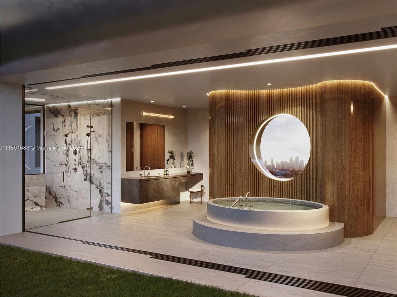 This luxurious bathroom features a minimalist aesthetic with a stunning round window offering a panoramic city view. The color palette combines soft neutral tones with contrasting dark stone surfaces. A freestanding soaking tub is elegantly positioned on a raised platform, with gentle lighting accentuating its curves. The sink area boasts dark marble countertops paired with sleek fixtures, complemented by wooden accents that add warmth. A glass shower, with ornate marble walls, stands adjacent, enhancing the sophisticated vibe. The integration of natural light through expansive windows creates an inviting, serene atmosphere, perfect for relaxation.