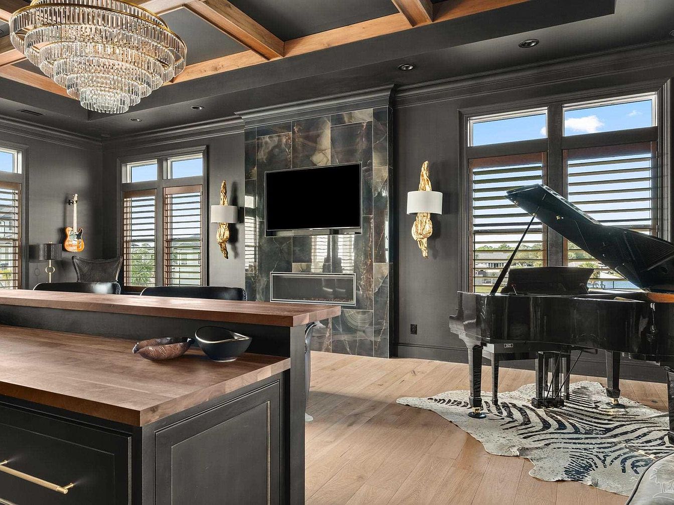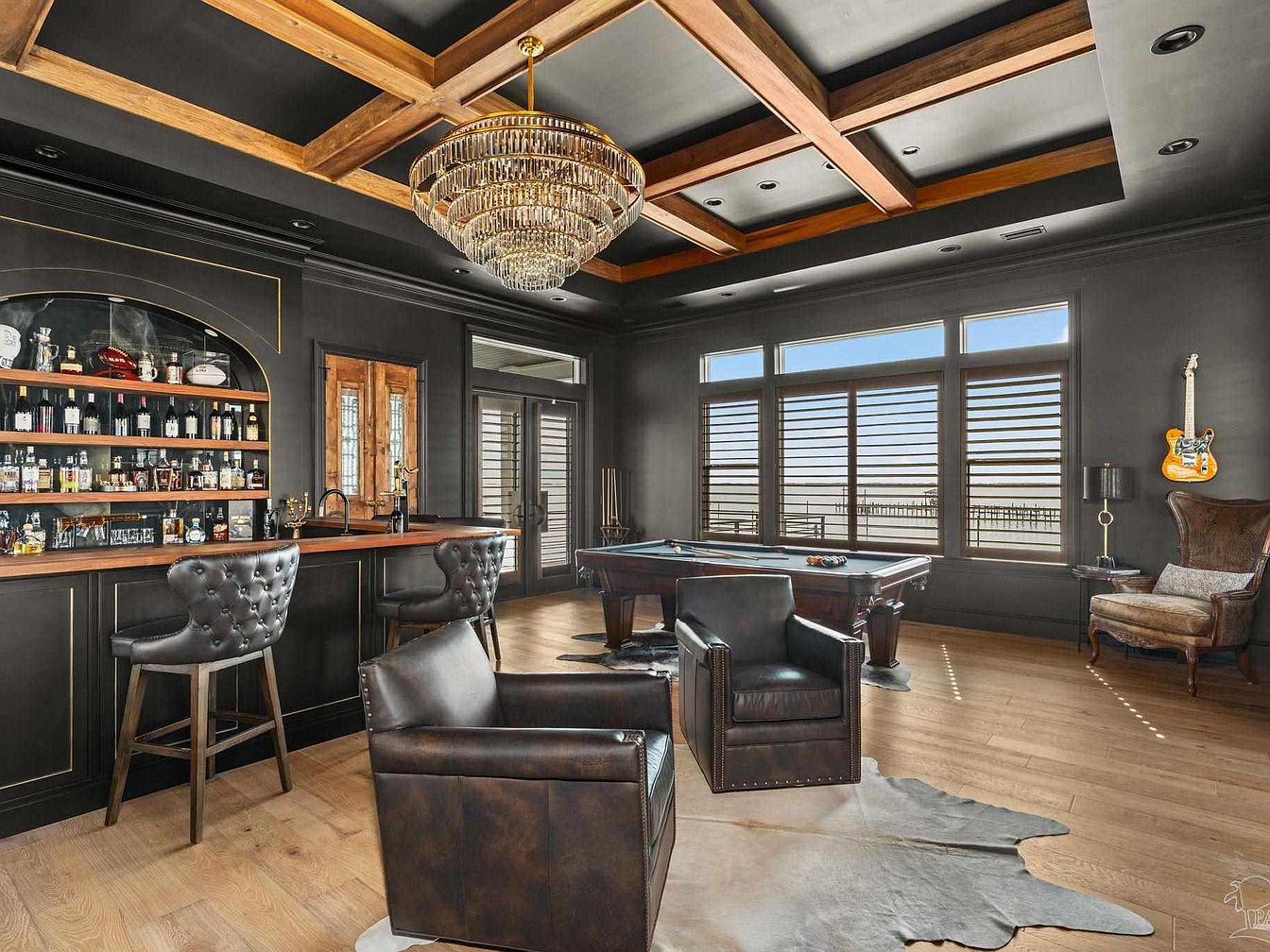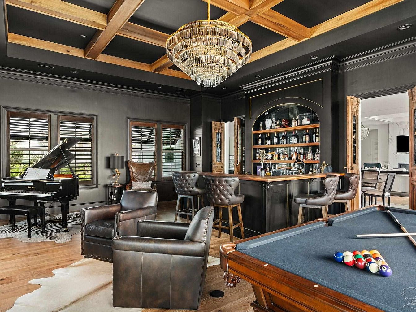 This game room features a sophisticated blend of leisure and elegance. Dark walls lend a dramatic contrast to the warm, natural tones of the wooden ceiling beams and flooring. A sleek black grand piano elegantly occupies one corner, harmonizing with the rich leather armchairs that provide comfortable seating. A stylish pool table takes center stage, complemented by a curated bar area boasting an array of bottles neatly arranged behind a glossy black countertop. Large windows with plantation shutters fill the space with natural light while highlighting refined architectural details, including an ornate chandelier that adds a touch of glamour.