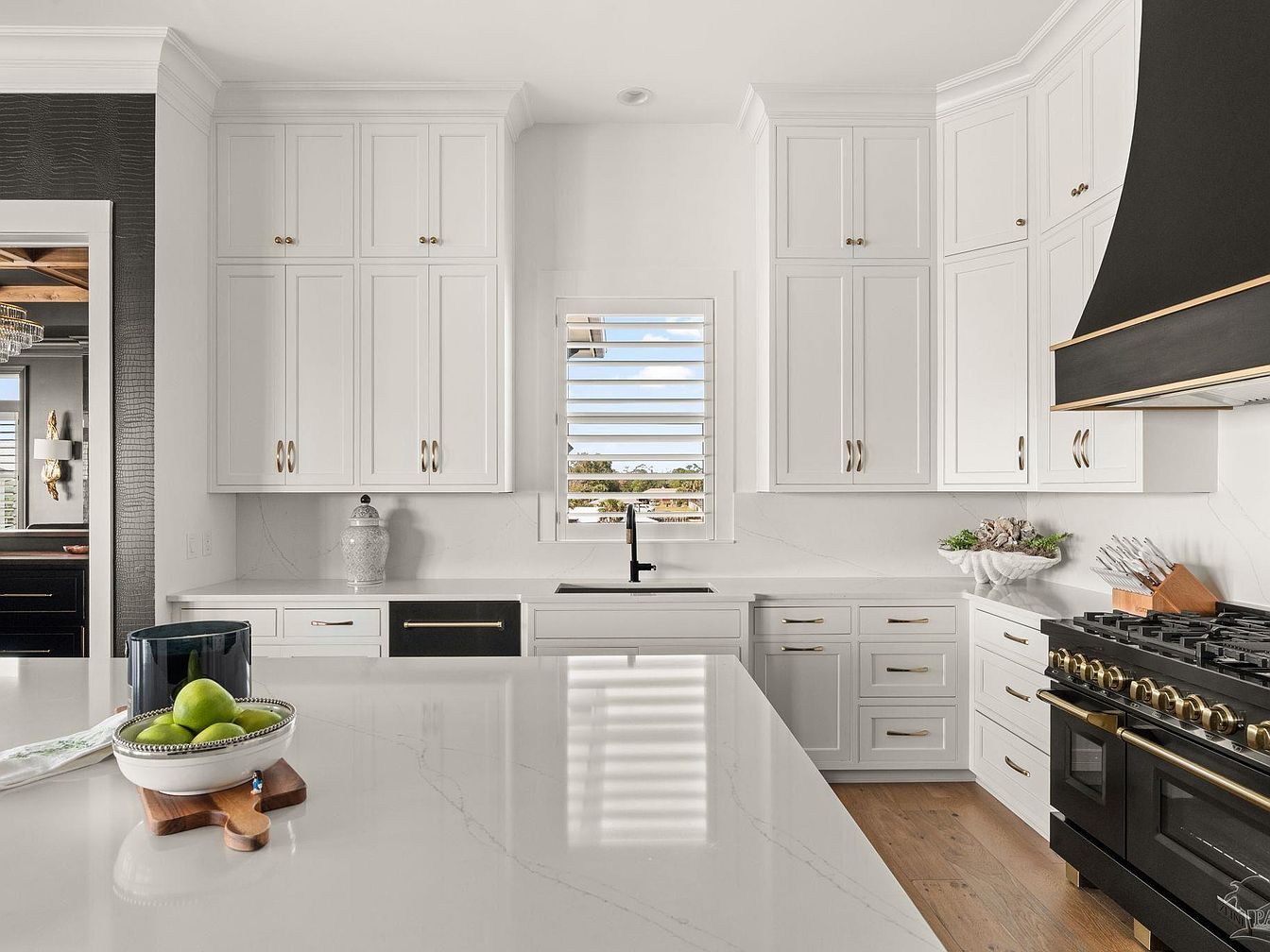 A modern kitchen showcasing a sleek layout with a mix of crisp white cabinetry and rich black appliances. The cabinetry features elegant gold hardware, providing a touch of sophistication. A large island dominates the space, topped with a smooth, light-colored countertop that complements the overall aesthetic. Natural light streams in through a window covered with stylish shutters, illuminating the open area. The contrasting black range hood adds a bold focal point above the range, enhancing the contemporary design. Decorative elements include a tasteful centerpiece with fresh produce, contributing to an inviting and functional culinary space.