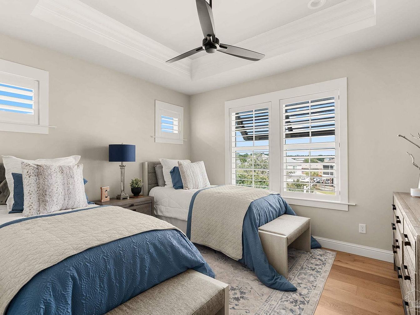 This cozy bedroom features two twin beds dressed in layered bedding, combining soft grey and rich blue hues. The walls are painted a warm beige, complementing the natural light streaming through plantation-shuttered windows. The ceiling boasts a stylish design, enhancing the space’s height. A modern ceiling fan adds a touch of functionality. Each bed is paired with a textured throw and multiple decorative pillows for added comfort. A simple wooden nightstand stands between the beds, topped with a lamp in blue tones, while a low bench provides additional seating. A light-hued area rug anchors the space.