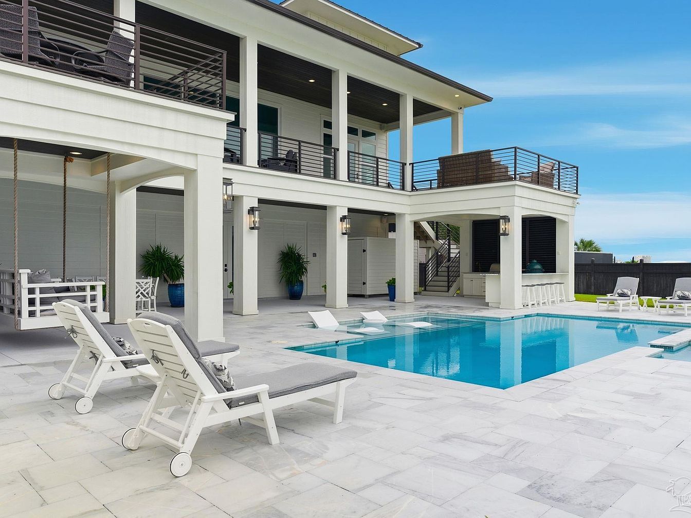 The outdoor patio features a spacious layout with a modern design, showcasing a serene pool area surrounded by manicured grass. White loungers and a stylish outdoor dining set provide ample seating, while the stark contrast of dark mulch against the vibrant green lawn enhances the aesthetic. The home’s architecture, characterized by large windows and a blend of white and brown tones, emphasizes an inviting atmosphere. A second-floor balcony offers additional leisure space, framed by elegant railings and topped with a muted metal roof. This tranquil outdoor setting is perfect for relaxation and entertainment.