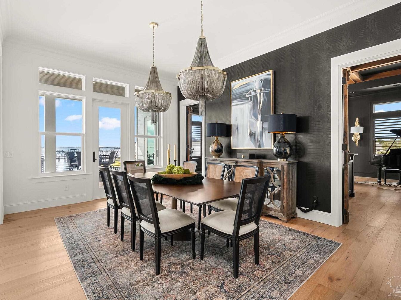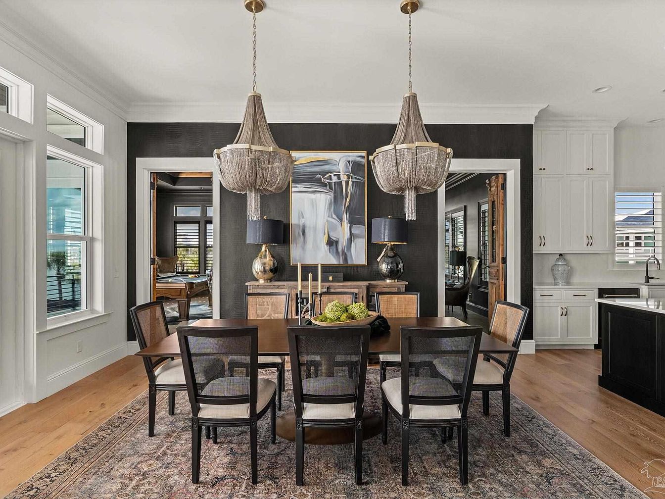 The dining room features an elegant table set for six, surrounded by stylish chairs with translucent backs. A richly colored area rug adds warmth, complemented by hardwood flooring. The walls are adorned in a deep charcoal hue, creating a sophisticated contrast with the white trim and large windows that allow natural light to flood the space, highlighting the greenery outside. A statement chandelier hangs gracefully from the ceiling, while distinctive artwork serves as a focal point. Nearby, a black sideboard and a sleek kitchen visible through an open doorway enhance the contemporary aesthetic of this inviting dining area.