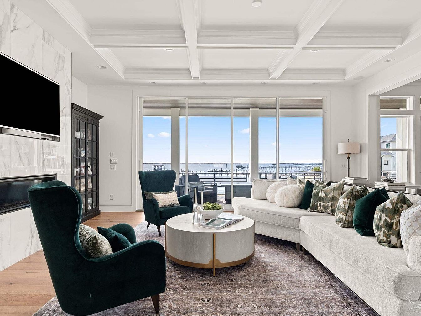 A spacious living room featuring a large sectional sofa adorned with a variety of textured and patterned pillows in greens and neutrals. A circular coffee table sits centrally, enhancing the modern aesthetic. Two striking velvet armchairs in deep green provide contrasting elegance. The room’s layout includes large windows, framing a stunning waterfront view, allowing natural light to flood in. A marble-featured wall with a flat-screen TV creates a sophisticated focal point, while the coffered ceiling adds depth and character. The warm wooden floor is accented by a vintage area rug, blending contemporary and classic design elements seamlessly.