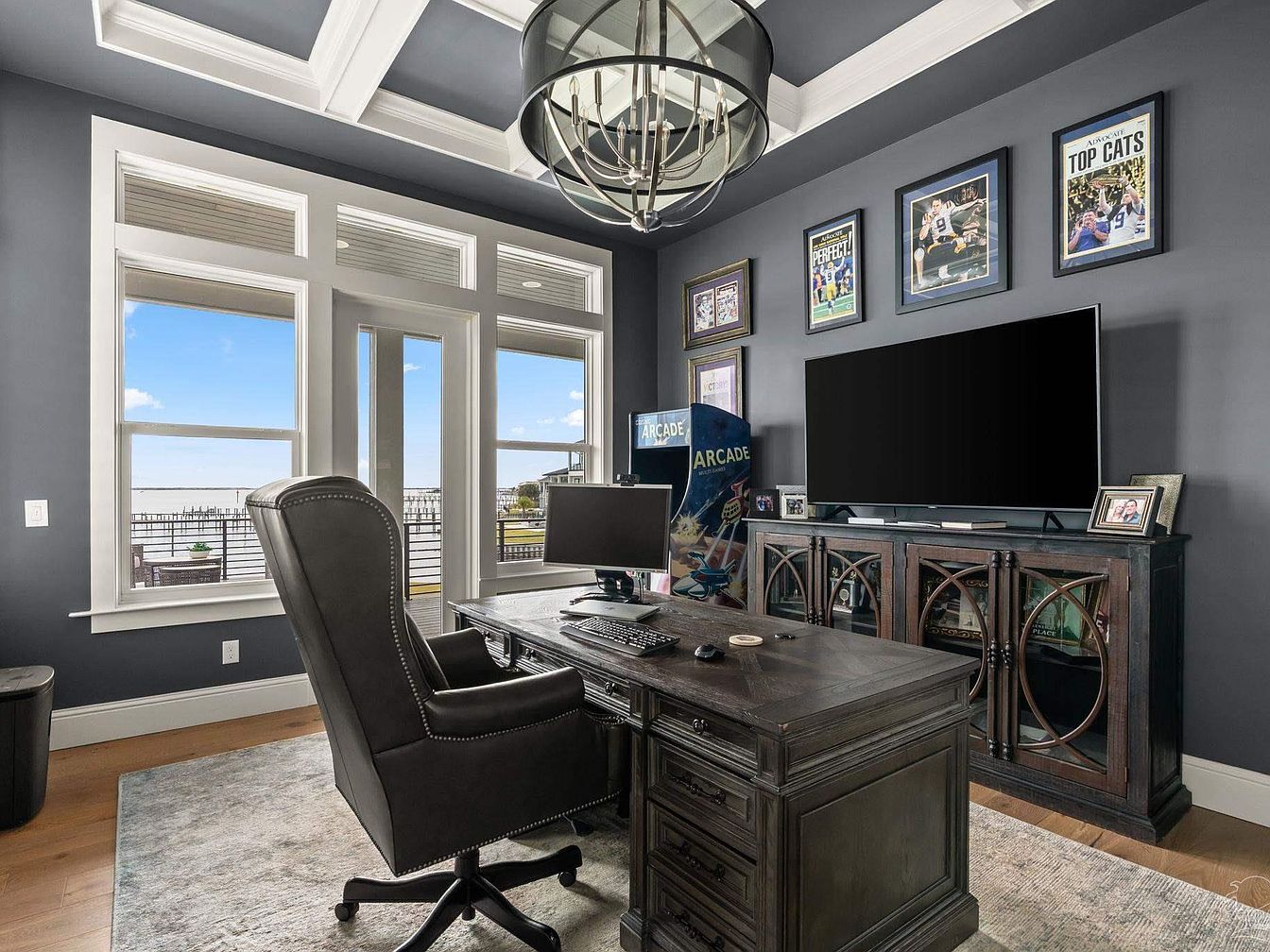 The home office features a rich palette of deep gray walls and warm wooden flooring. A large, dark wood desk sits prominently, showcasing intricate details and ornamental drawers. Soft, plush seating includes a high-backed chair with metallic accents. Natural light floods the space through expansive windows, framing a scenic view. Along the walls, artwork and sports memorabilia create a personal touch, enhancing character. A sleek television stands above a stylish console with glass accents, complementing the modern aesthetic. The room’s coffered ceiling adds depth, while the contemporary chandelier infuses elegance, balancing functionality and style.
