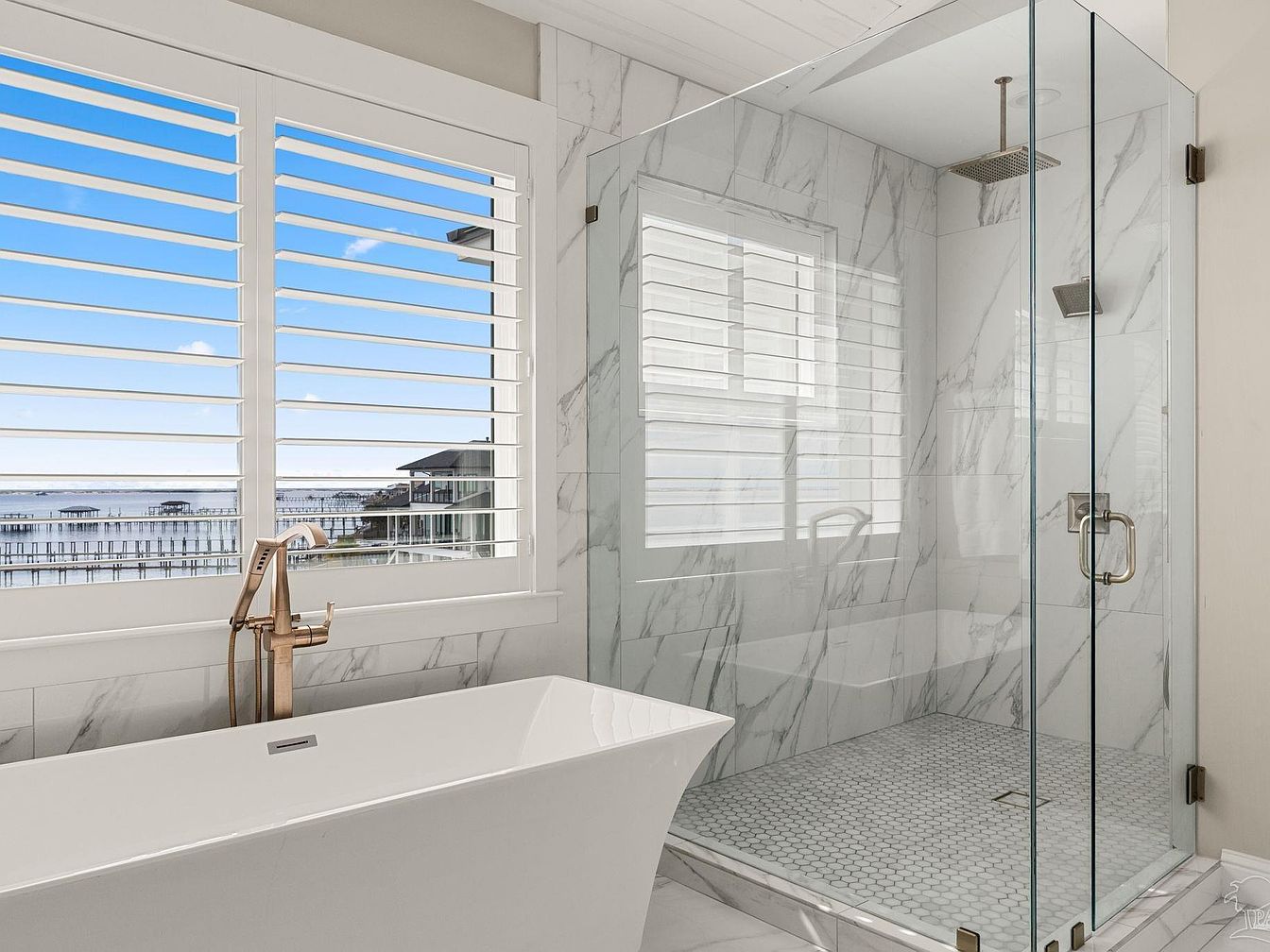 A modern bathroom features a sleek, freestanding bathtub positioned next to a large glass shower enclosure. The shower’s minimalist design includes marble walls with subtle veining and a hexagonal tiled floor. Natural light floods the space through plantation-shuttered windows, opening to a scenic view of a waterfront. The soft, neutral color palette, with shades of white and pale grey, creates a serene atmosphere. A stylish, brushed gold faucet adds a touch of elegance, while the contrasting textures of the smooth tub and tiled surfaces enhance the contemporary aesthetic.