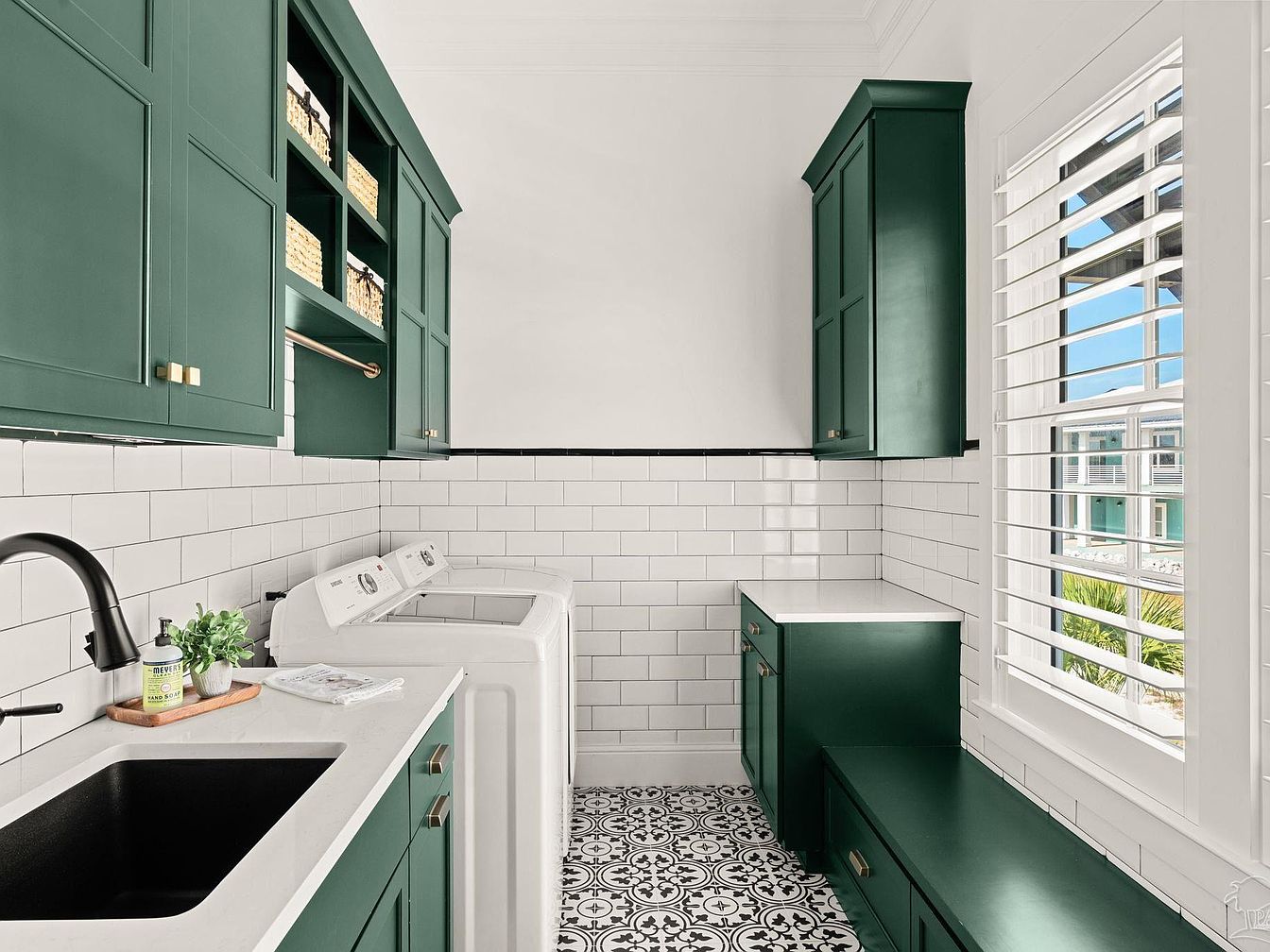 The laundry room features rich emerald green cabinetry that adds a vibrant contrast against the white subway tiles. Clean lines define the space, with the cabinets extending to the ceiling, maximizing storage. A sleek black sink complements the gold hardware accents, enhancing the room’s elegance. The washer and dryer sit side by side beneath the counter, providing functional convenience. The patterned black and white flooring introduces a touch of charm and visual interest, while the large window with plantation shutters invites natural light, creating a bright and welcoming atmosphere throughout the area.