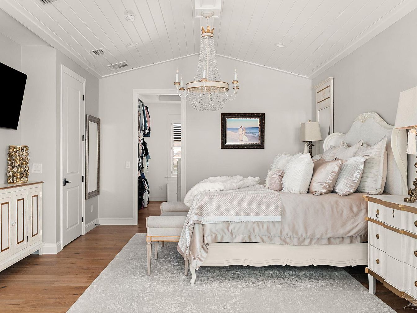 This cozy bedroom features a soft color palette of gray and beige, complemented by warm wooden floors. The sloped ceiling is adorned with white paneling, enhancing the spacious feel. A plush bed, styled with an abundance of decorative pillows and a light quilt, invites relaxation. An elegant chandelier hangs above, adding a touch of sophistication. A nearby nightstand with a classic lamp provides ambient lighting. The room also includes a framed artwork of a couple on the beach, adding a personal touch. Adjacent, a doorway leads to a well-organized closet, ensuring convenient storage.