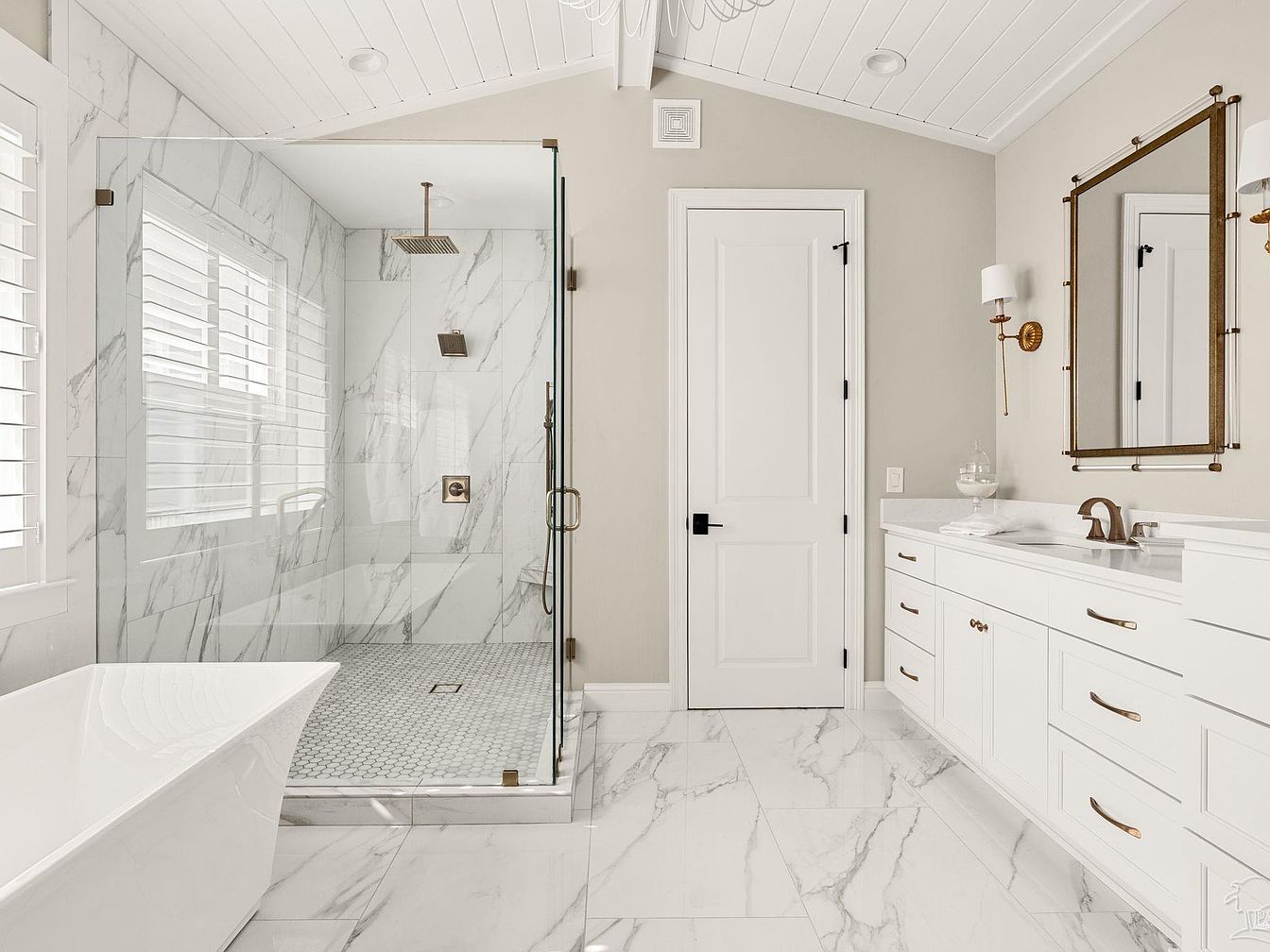 A luxurious bathroom combines modern design with classic elegance. The color scheme features soft beige walls that complement the white marble accents. A stunning glass-enclosed shower flaunts marble tiling, while a sleek rain showerhead adds sophistication. Opposite, a freestanding, sculptural white bathtub invites relaxation. Beneath a large mirror framed in warm gold, a double vanity showcases polished bronze fixtures, emphasizing a contemporary yet timeless touch. Subtle trim work and a coffered ceiling enhance visual interest, while natural light floods through plantation shutters, creating an airy ambiance. The overall aesthetic reflects tranquility and upscale comfort.