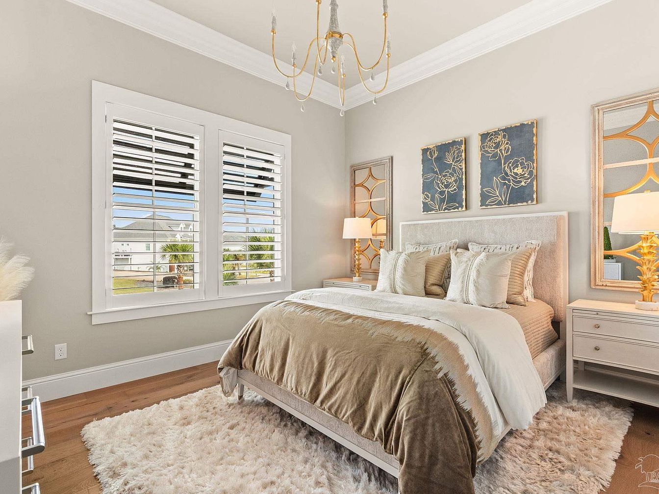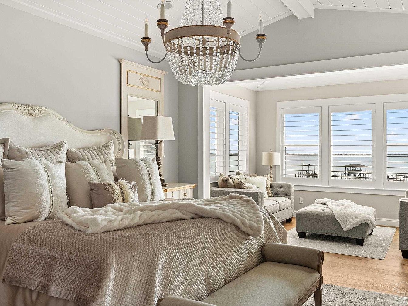 A serene bedroom features a plush, king-sized bed adorned with an assortment of soft, neutral-toned pillows, creating a cozy focal point. The headboard is elegantly shaped, complementing the light gray walls. A stunning crystal chandelier hangs above, adding a touch of glamour. Natural light floods through expansive windows dressed with shutters, revealing a tranquil water view. The flooring is warm hardwood, with a soft area rug beneath the bed. Minimalist furniture includes a stylish nightstand and an inviting armchair, while a decorative throw blanket drapes invitingly across the bed, enhancing the room’s tranquil aesthetic.