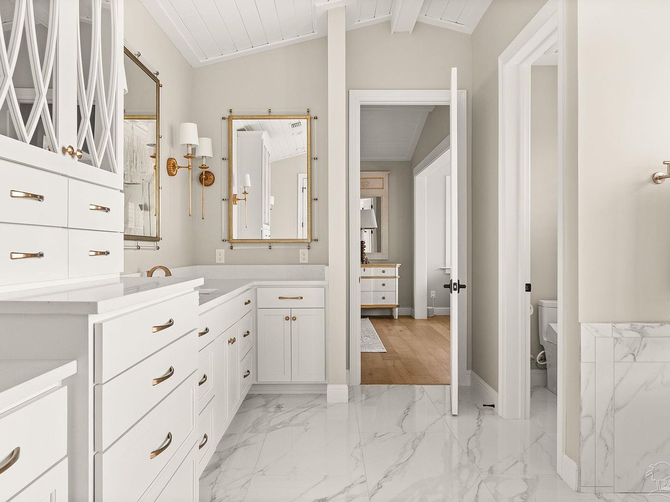 This elegant bathroom features a bright and airy layout enhanced by a vaulted ceiling and soft color palette of gray and white. A double vanity with white cabinetry and brass hardware offers ample storage. Above the counters, two large rectangular mirrors with gold frames reflect the space, complemented by wall sconces that add a warm glow. Marble flooring with delicate veining contrasts beautifully with the cabinetry. A glimpse of the adjacent room is visible through an open doorway, where light wood flooring connects the spaces, creating a harmonious flow throughout this serene environment.