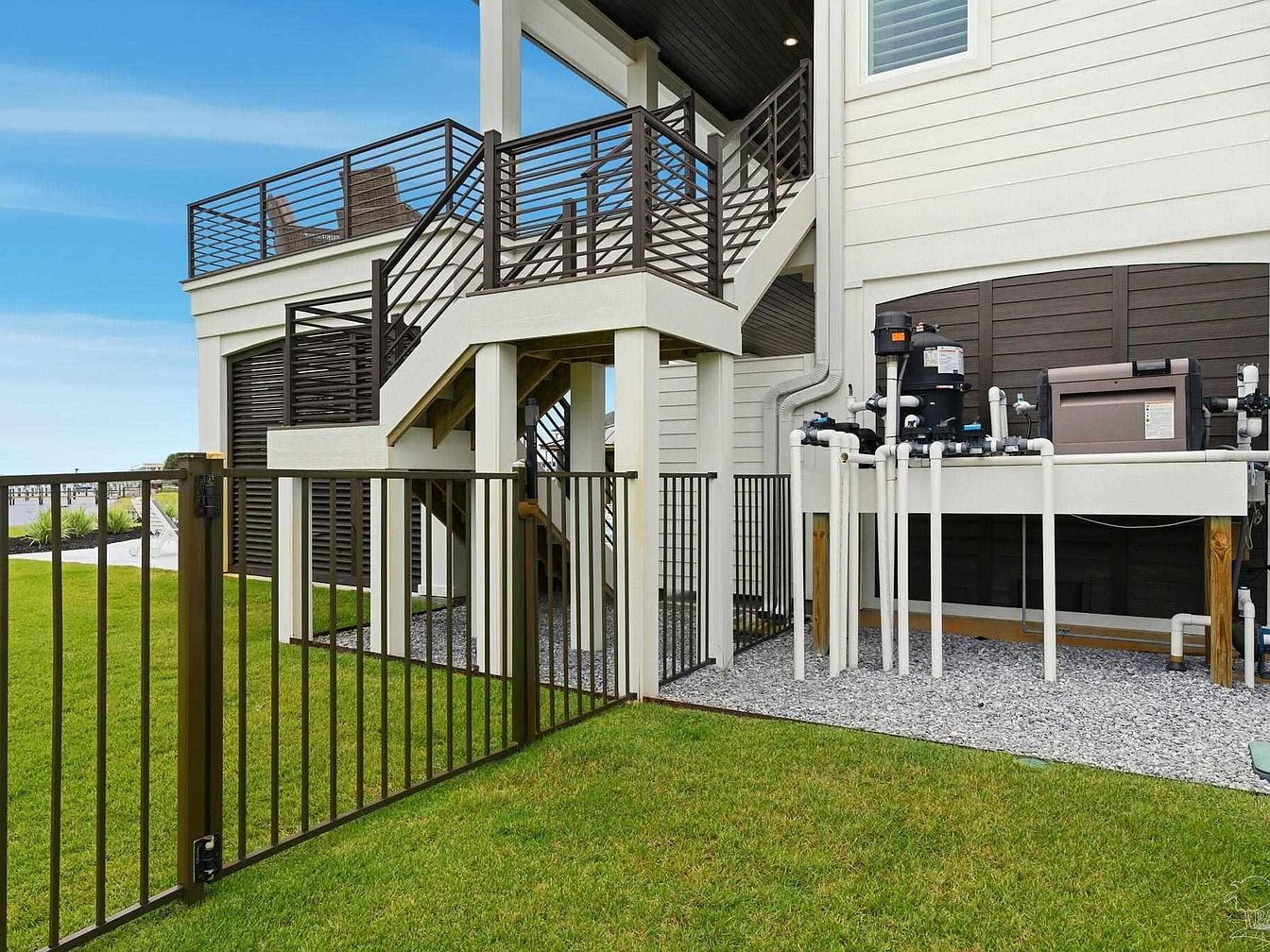 This outdoor space features a sturdy staircase leading to an upper deck, framed by sleek black railings that enhance safety while offering a contemporary aesthetic. The home showcases a mix of light and dark materials; the exterior boasts white siding contrasted by dark wooden panels. Beneath the stairs, a grassy area is bordered by an elegant metal gate, creating a secure entrance to the yard. The landscape features well-manicured grass and gravel, providing a clean, modern contrast. Functional equipment for maintenance is organized neatly, maintaining a tidy appearance. Overall, this area blends functionality with modern design.