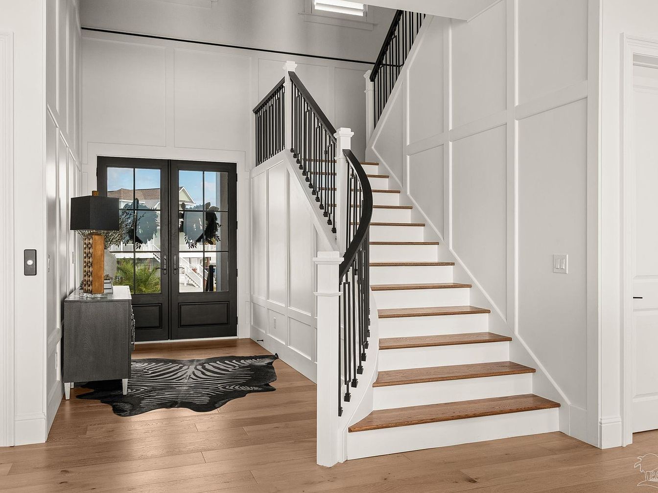 The entryway features a grand staircase with elegant wooden steps and a smooth white railing, enhancing the room’s height. Walls exhibit crisp white paneling, creating a refined atmosphere. A pair of large double doors with black frames invites natural light and connects to outdoor views. A modern, dark wood console table stands to the side, adorned with a stylish grass-like table lamp. A plush black rug with a leaf design adds texture beneath, contrasting beautifully with warm wood flooring. This space captures a blend of classic and contemporary styles, promoting welcoming aesthetics and functionality.