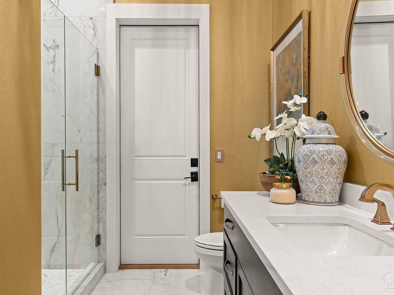 This elegant bathroom features a sleek design with a gold textured wall that adds warmth and sophistication. A spacious shower is enclosed with clear glass, showcasing stylish marble tiles. The white door contrasts beautifully with the walls and leads to the adjoining spaces. A modern vanity with a white countertop showcases a chic brushed gold faucet. Decorative elements include a large round mirror, an ornate ceramic vase filled with white orchids, and a patterned blue-and-white jar. The light-colored marble flooring enhances the airy feel, creating a luxurious yet inviting atmosphere.