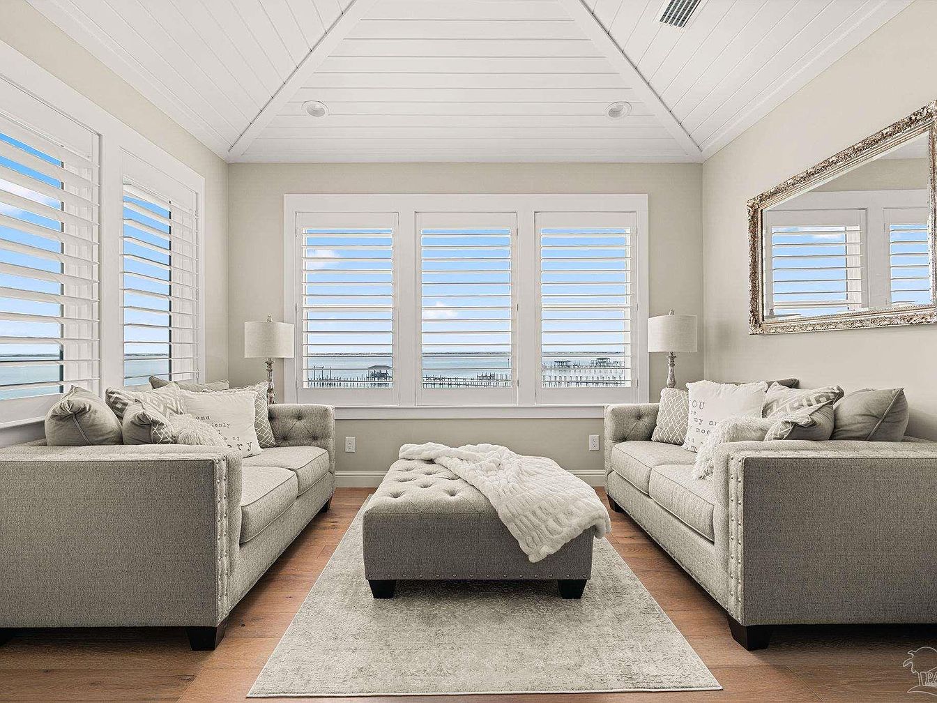 This living room features a modern yet cozy design with light gray sofas adorned with throw pillows in varying textures. The furniture arrangement centers around a stylish tufted ottoman, providing a functional coffee table alternative. Large, plantation-style windows flood the room with natural light, accentuating the soft beige walls and warm wood flooring. A contemporary lamp stands beside one sofa, adding a touch of elegance. The sloped ceiling enhances the spacious feel, while a decorative mirror reflects light and gives depth to the space. A subtle area rug complements the overall color palette, creating a serene atmosphere.