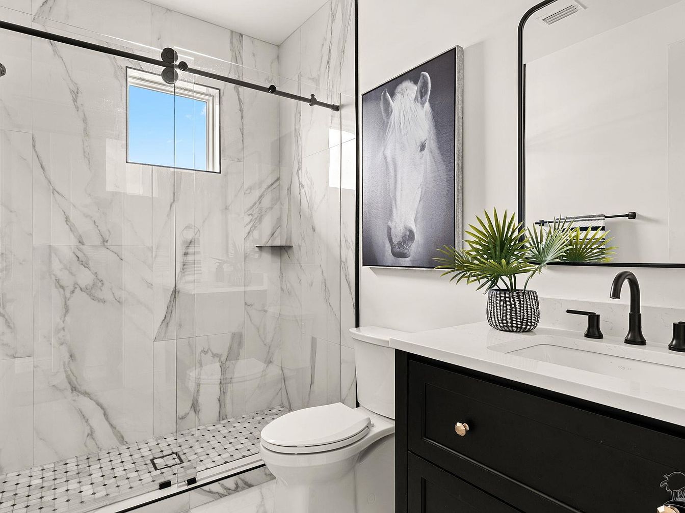This modern bathroom features a sleek design with a striking contrast between the white marble walls and black fixtures. Large marble tiles, showcasing subtle gray veining, create a luxurious atmosphere. A glass shower enclosure adorned with a black sliding door complements the contemporary aesthetic. The white countertop is enhanced by a minimalist black faucet and a charming plant in a woven pot, adding a touch of greenery to the space. Above the sink, a large round mirror framed in black pairs with a striking horse portrait, creating an artistic focal point. The overall color scheme is a sophisticated blend of white, black, and natural elements.
