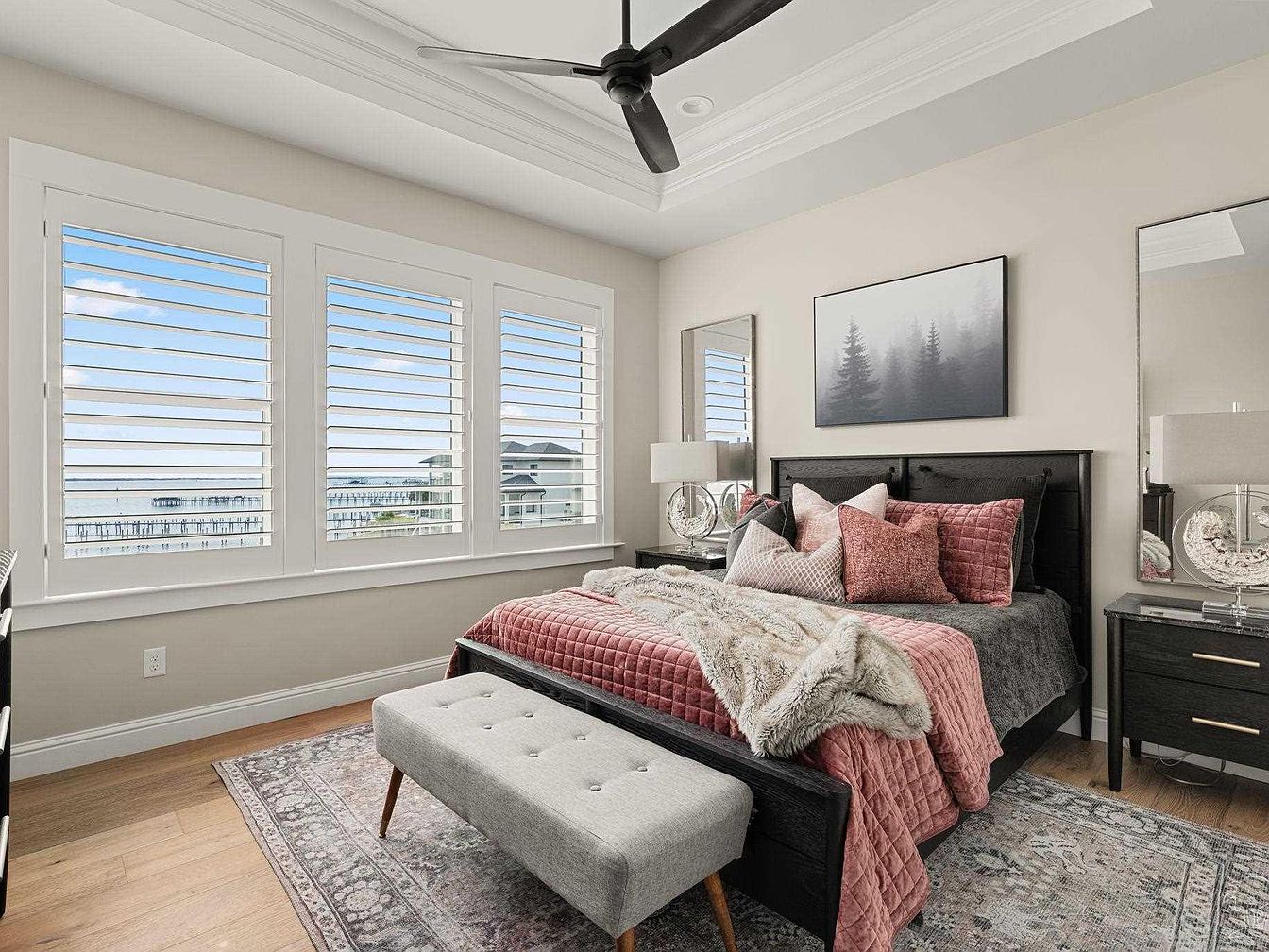 A tranquil bedroom space with large, organized windows featuring white plantation shutters that frame a serene view of the water. The color scheme blends soft neutral tones with rich burgundies and grays, creating a calming atmosphere. A sleek black bed with an intricately textured quilt showcases multiple plush pillows in varying shades, inviting comfort. Beside the bed, elegant side tables hold sophisticated lamps with clear bases. A stylish gray upholstered bench at the foot of the bed adds practical seating, while a delicate patterned area rug enhances the floor’s warmth, drawing the eye to the overall harmony of the space.