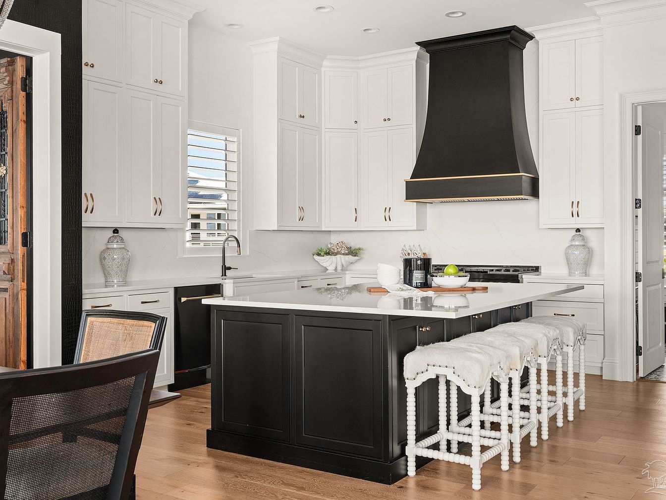 The kitchen exudes a modern elegance with a blend of white and black cabinetry. The upper cabinets are sleek and white, adorned with brass hardware, while the lower section features a stylish black finish. Central to the room is a large island topped with a polished white countertop, complemented by plush, white upholstered bar stools with unique beaded legs. A striking black hood ranges above the stove, acting as a focal point. Natural light floods in through a window, highlighting the engineered wood floors, which warm the overall aesthetic. Decorative elements, like a vase and fresh produce, add a touch of vibrancy.