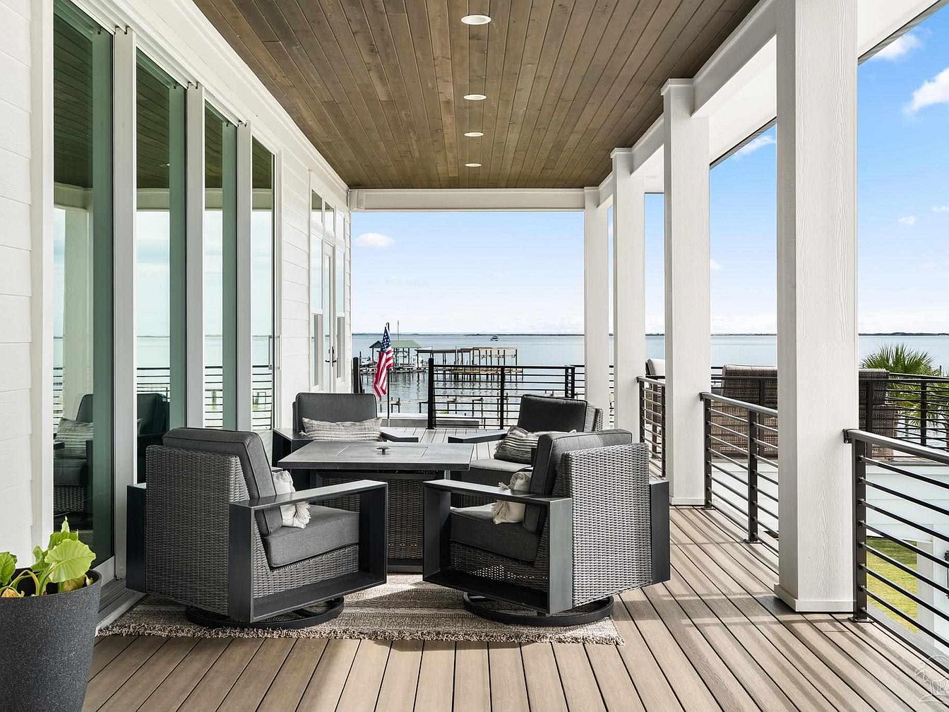 This outdoor patio features a blend of contemporary design and comfort, highlighted by a dark wooden ceiling that contrasts beautifully with the white exterior walls. Glass sliding doors open to a scenic view of the water, allowing natural light to flood the space. Comfortable seating includes several plush, gray, wicker armchairs that encircle a sleek, rectangular table. A subtle area rug adds warmth underfoot, while potted plants contribute a touch of greenery, enhancing the inviting atmosphere. The railings provide a modern aesthetic and safety, with the distant water and sky creating a serene backdrop for relaxation.