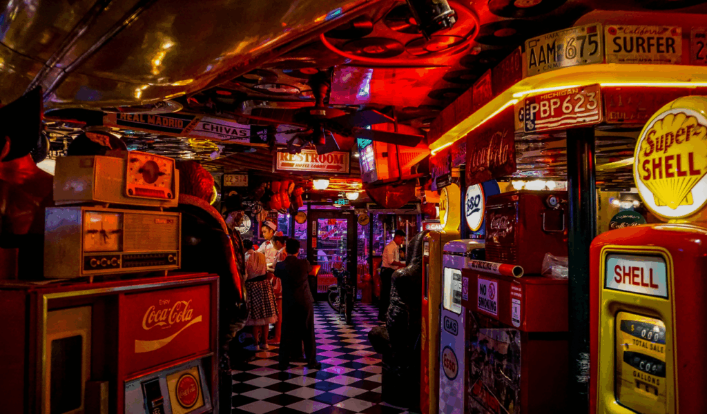 Diners with a retro theme try to bring back the style of the 1950s and 1960s with patterned floors, bright colours, and decor that looks like old TV shows. They often play old songs, hang up old posters, and serve simple food that fits the fun and nostalgic mood. The overall look is perfect for fans who want a bright, TV-like setting. When you sit down in one of these diners, it feels like you’re in a scripted scene where every detail adds to the fun, happy atmosphere that many early TV restaurants had.