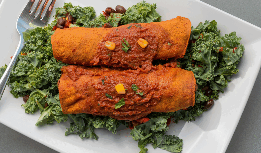 Simply put, enchiladas are tortillas filled with shredded chicken, cheese, beans, or vegetables and then baked in a sauce. To save work, use homemade or canned red or green enchilada sauce. Line a baking dish, lightly dip each tortilla, add your filling, roll, pour sauce over, sprinkle cheese on top, and bake until bubbly. You don’t need fancy techniques or precise folding because the majority of the cooking happens in the sauce stage. If the sauce is thin or a tortilla breaks, it’s acceptable. Serve with rice, beans, and a chopped onion or cilantro as a fresh garnish.