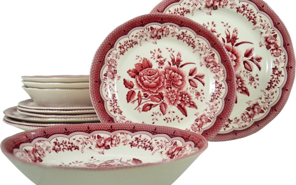 Cranberry and pink transferware bring a softer side to vintage dining with romantic prints in rosy tones. These pieces often feature pastoral landscapes, florals, or intricate scrollwork on white backgrounds. Developed in the 19th century, they became symbols of warmth and refinement. The gentle contrast between pink hues and clean porcelain creates visual harmony that works well for tea parties, spring gatherings, or festive meals. Their cheerful color complements floral arrangements and candlelight, making each setting feel personal and inviting without overwhelming the table’s overall design.