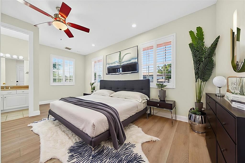 This bedroom showcases a serene design with a plush, gray upholstered bed adorned with soft, neutral bedding and a stylish throw blanket. The walls are painted a calming light green, complementing the warm wood flooring. Natural light pours in through white shuttered windows, framed by elegant greenery and modern decor. A sleek bedside table hosts a round lamp, while a textured area rug adds warmth and comfort underfoot. The wall-mounted TV offers modern convenience. An open doorway leads to a bright bathroom area with contrasting white cabinetry, emphasizing the spaciousness and light-filled ambiance of the room.