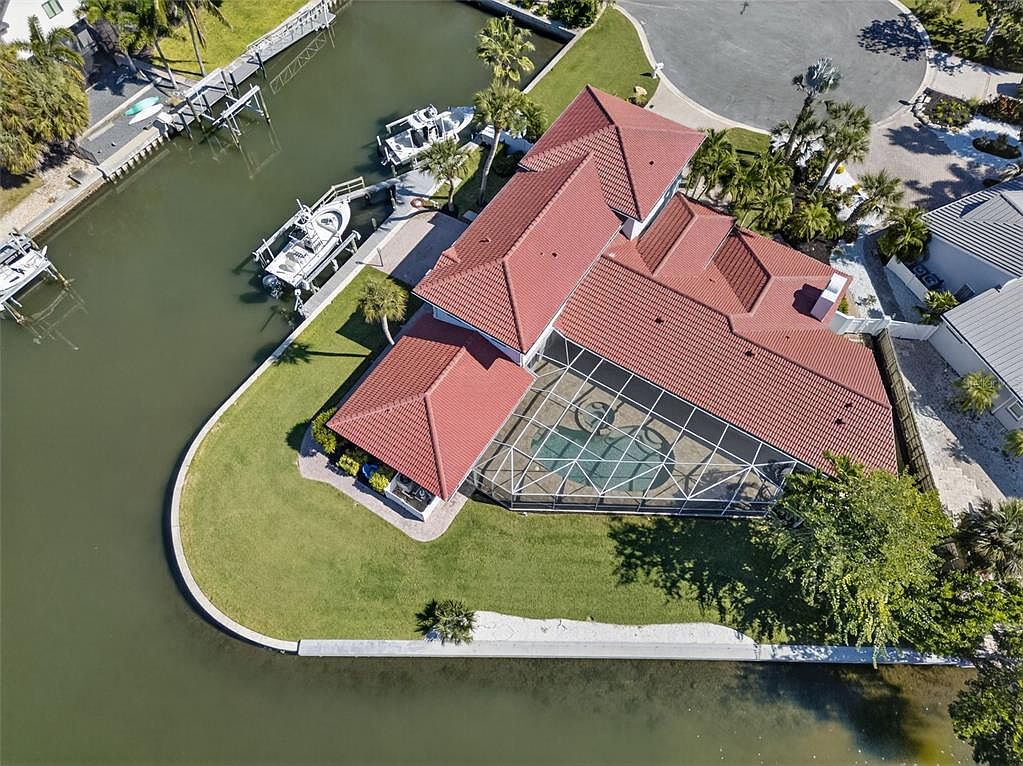 This aerial perspective showcases a spacious residential property nestled beside a calm canal, capturing the structured elegance of the home. A terracotta tiled roof with multiple peaks presents architectural charm, while the vibrant green lawn surrounding the house augments its curb appeal. A screened pool area with intricate designs can be seen, inviting relaxation. Adjacent to the property, boats are moored along wooden docks, blending functionality with leisure. The landscape is dotted with palm trees, enhancing the tropical ambiance, while the circular driveway hints at an inviting entry. There’s a seamless integration of nature and design.