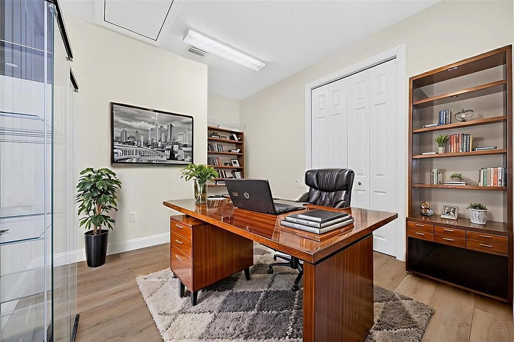 This home office features a sleek, modern design with a polished wooden desk positioned prominently in the center. A comfortable black leather chair adds an element of luxury, while a laptop and stacked books create a functional workspace. The room is accented by pale walls that enhance the natural light from overhead fluorescent fixtures. To the left, a tall glass shelving unit showcases decorative items and plants. A small, green potted plant adds a touch of freshness. To the right, a wooden bookshelf displays neatly arranged books and accessories, contributing to a sophisticated yet inviting atmosphere.